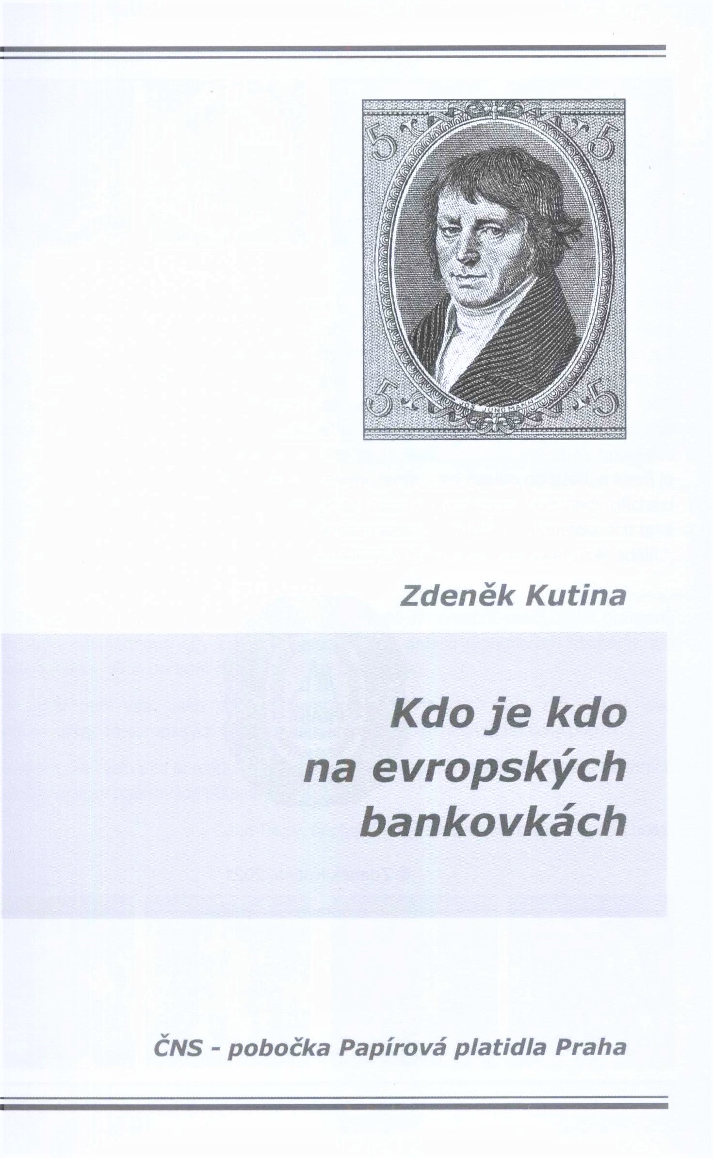 Kdo je kdo na evropských bankovkách / Zdeněk Kutina ; obálka a grafická úprava Jan Bajer. -- První vydání. -- Praha : ČNS - pobočka Papírová platidla, 2021. -- Praha : MHTisk s.r.o. -- 246 stran : portréty, faksimile ; 22 cm. -- Vazba s barevnými portréty osobností, barený text. - Na předsádkách černobílé portréty osobností. - Černobílý portrét na titulním listu. - Logo ČNS na rubu titulního listu. - Úvod J. Bajer (černobílé portréty). - Černobílé portréty, faksimile s popisky. - O ČNS, pobočka Papírová platidla. - Obsah. - Barevné portréty a logo ČNS na zadní straně vazby. -- Contains also: Obsahuje: Figurální motivy na evropských bankovkách. -- Summary: Přehled významných osobností, které jsou vyobrazeny na bankovkách evropských zemí. -- ISBN : 978-80-270-9961-0 (vázáno).