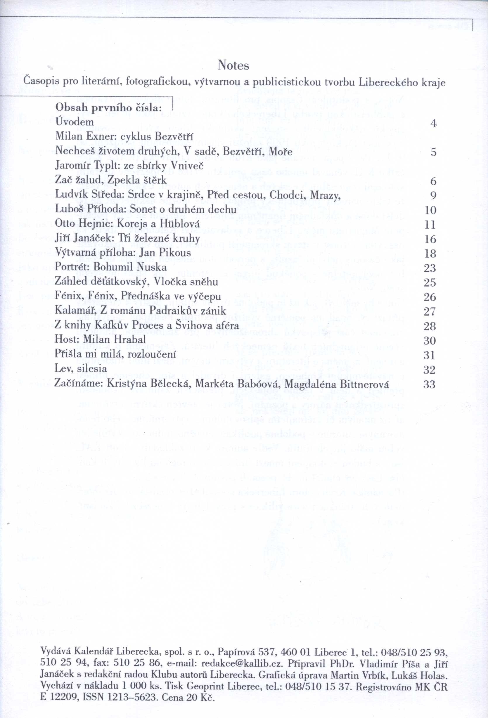 Title information Notes : časopis pro literární, fotografickou, výtvarnou a publicistickou tvorbu Libereckého kraje Další autoři Píša, Vladimír, 1959- (Redactor) Janáček, Jiří, 1927-2023 (Redactor) Corporation Kruh autorů Liberecka (Publisher) Geoprint (tiskárna) (Printer) Roč., číslo Číslo 1, 2001 Publication Liberec : Kalendář Liberecka, spol. s r. o. 2001 Manufacture Geoprint Liberec Scope 37 stran : ilustrace, fotografie ; 21 cm ISSN 1213-5623 Country Czech Republic Language Czech Note Čb. ilustrace v textu, barevné fotografie v příloze. - 1000 výtisků