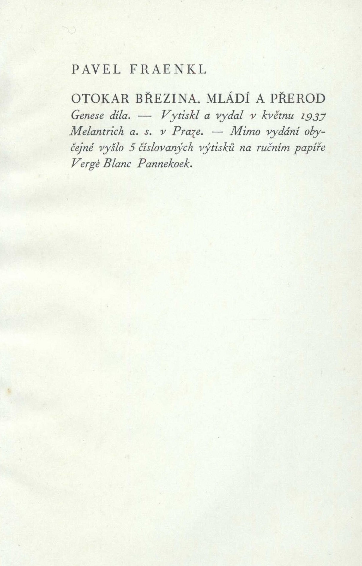 "Mimo vydání obyčejné vyšlo 5 číslovaných výtisků na ručním papíře Vergè Blanc Pannekoek"--Tiráž.