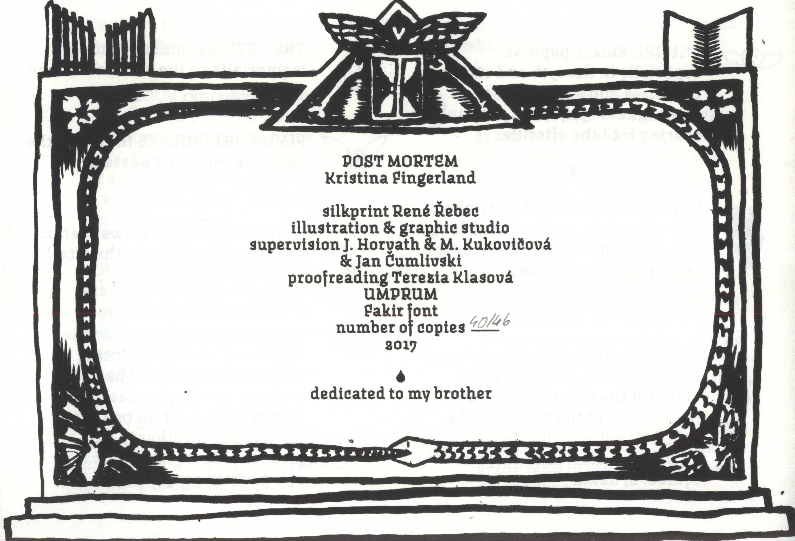Title information Post mortem / Kristina Fingerland ; silkprint René Hřebec Personal name Fingerlandová, Kristina, 1991- (Author) (Illustrator) (Book designer) Další autoři Hřebec, René, 1969- (Printmaker) Corporation Uměleckoprůmyslová škola (Praha, Česko) (Publisher) Publication [Praha] : UMPRUM, 2017 Manufacture [Praha] : René Hřebec Scope 30 nečíslovaných stran : ilustrace ; 17x 24 cm ISBN (Brožováno) Country Czech Republic Language English Note Černá barevně ilustrovaná obálka. - Bílá, černě ilustrovaná vazba. - Frontispis. - Červený text na titulním listu. - Černobílé a barevné ilustrace, texty. - Symbolika (drobné černobílé ilustrace). - Tiráž ve zdobném černobílém rámu, dedikace bratrovi. - Přebal.