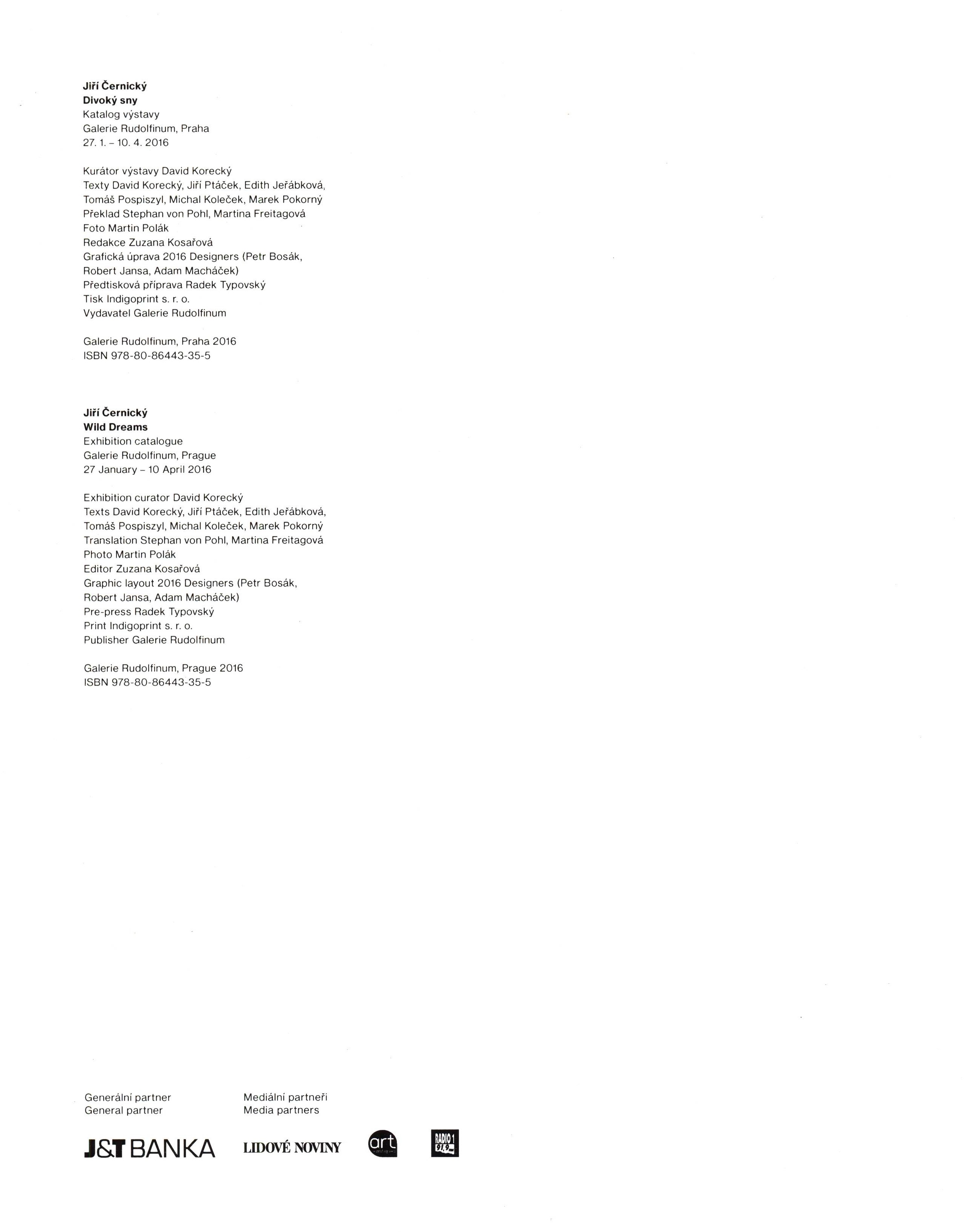 Názvové údaje Jiří Černický: Divoký sny = Jiří Černický: Wild Dreams : katalog výstavy : Galerie Rudolfinum Praha, 27.1. - 10.4.2016 / kurátor výstavy David Korecký ; texty David Korecký, Jiří Ptáček, Edith Jeřábková, Tomáš Pospiszyl, Michal Koleček, Marek Pokorný ; překlad Stephan von Pohl, Martina Freitagová ; grafická úprava Petr Bosák, Robert Jansa, Adam Macháček (2016 Designers) Osobní jméno Černický, Jiří, 1966- (Umělec) Další autoři Korecký, David, 1976- (Kurátor výstavy) (Autor) Ptáček, Jiří, 1975- (Autor) Jeřábková, Edith, 1970- (Autor) Pospiszyl, Tomáš, 1967- (Autor) Koleček, Michal, 1966- (Autor) Pokorný, Marek, 1963- (Autor) Pohl, Stephan von, 1971- (Překladatel) Freitagová, Martina, 1990- (Překladatel) Bosák, Petr, 1985- (Knižní grafik) Jansa, Robert, 1985- (Knižní grafik) Macháček, Adam, 1980- (Knižní grafik) Korp. Galerie Rudolfinum (Praha, Česko) (Organizátor akce) (Nakladatel, vydavatel) Indigoprint (tiskárna) (Tiskař) Nakladatel Praha : Galerie Rudolfinum, 2016 Výrobce [Praha] : Indigoprint s.r.o. Rozsah 119 stran : ilustrace (převážně barevné) ; 28 cm ISBN 978-80-86443-35-5 (brožováno) Země vyd. Česko Jazyk dok. čeština * angličtina Jazyk orig. čeština Poznámky Bílá obálka s barevnými postavami. - Barevná zdobená přídeští. - Obsah. - Celostránkové barevné i černobílé reprodukce, fotografie (některé s popisky). - Texty, černobílé ilustrace, kresby. - Seznam exponátů. - Životopisná data, přehled výstav.