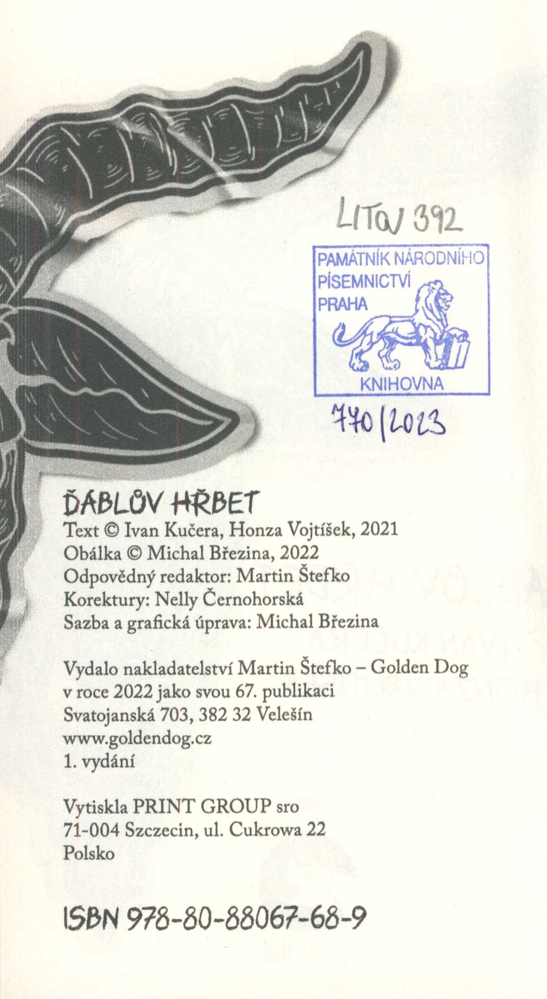 Title information Ďáblův hřbet / Ivan Kučera, Honza Vojtíšek ; obálka, sazba a grafická úprava Michal Březina Personal name Kučera, Ivan, 1981- (Author) Další autoři Vojtíšek, Honza, 1978- (Author) Březina, Michal, 1977- (Bookjacket designer) (Compositor) (Book designer) Corporation Nakladatelství Golden Dog (Publisher) Print Group (tiskárna) (Printer) Edition statement 1. vydání Publication Velešín : Golden Dog, 2022 Manufacture Szczecin : PRINT GROUP sro Scope 357 stran ; 17,5 cm ISBN 978-80-88067-68-9 (brožováno) Country Czech Republic Language Czech Note Zdobená barevná obálka. - Zdobený titulní list. - Poděkování. - Medailony autorů s foty. - Nakladatelská inzerce. - Anotace na zadní straně obálky.