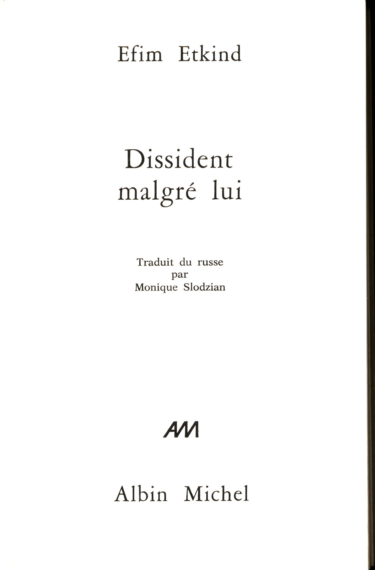 Title information Dissident malgré lui / Efim Etkind ; traduit du russe par Monique Slodzian Personal name Ètkind, Jefim Grigor'jevič, 1918-1999 (Author) Další autoři Slodzian, Monique (Translator) Corporation Albin Michel (nakladatelství, Paříž, Francie) (Publisher) Imprimerie Aubin (Ligugé, Francie) (Printer) Publication Paris : Albin Michel, 1977 Manufacture Ligugé : Imprimerie Aubin Scope 315 stran ; 20 cm ISBN 2-226-00528-5 (vázáno) Edition Les Grandes traductions/Document