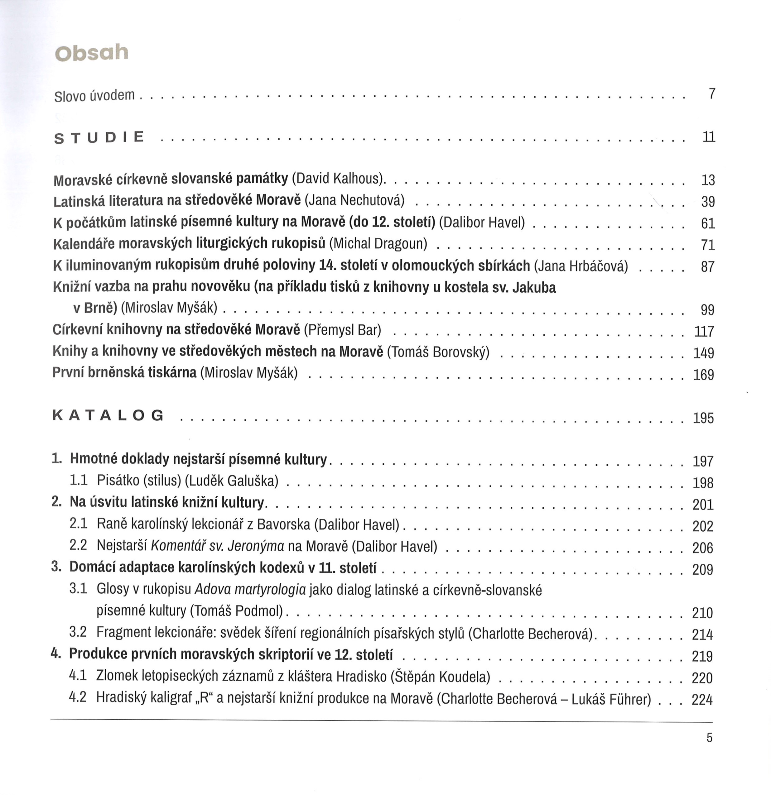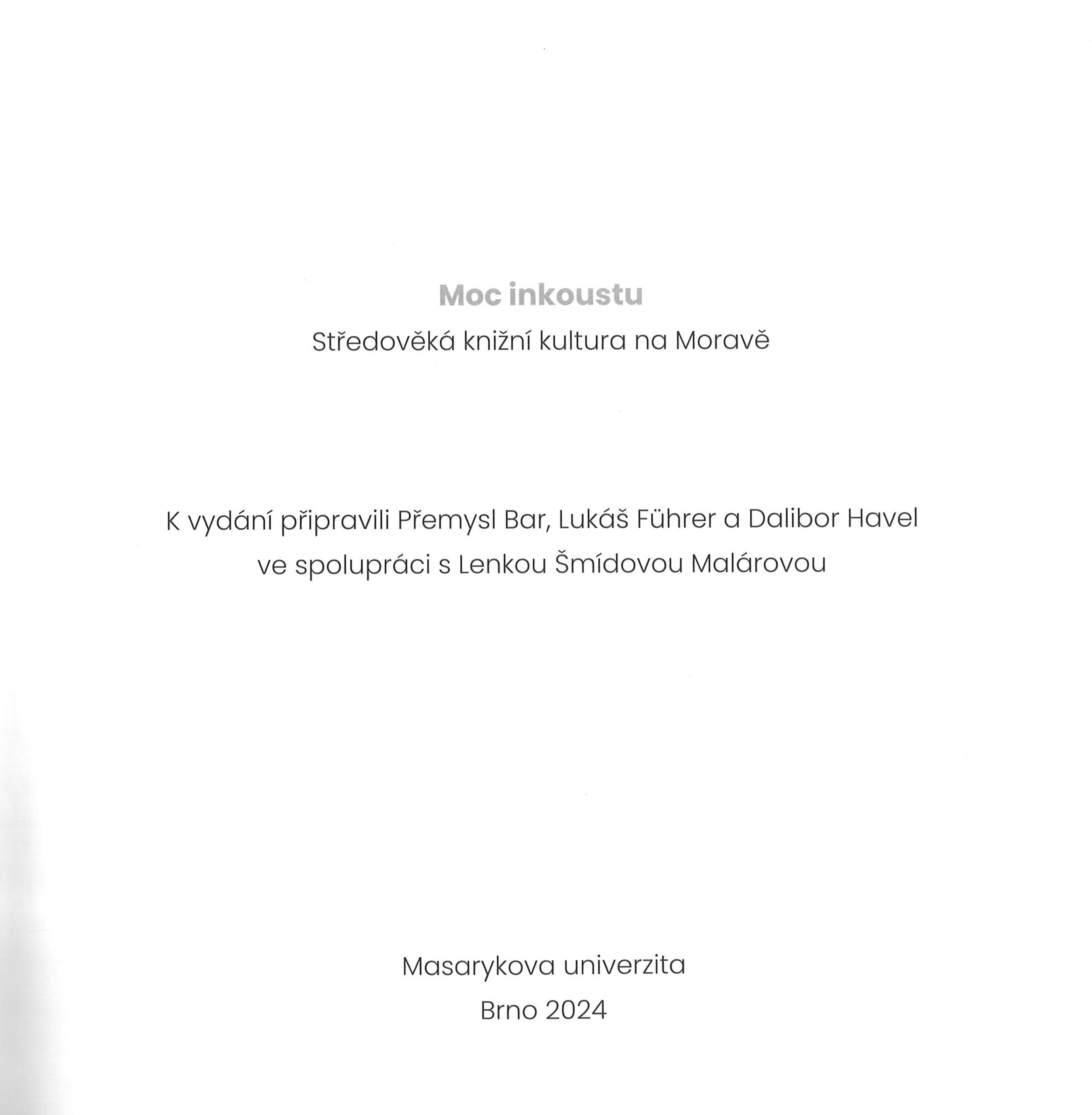 Moc inkoustu : středověká knižní kultura na Moravě / k vydání připravili Přemysl Bar, Lukáš Führer a Dalibor Havel ve spolupráci s Lenkou Šmídovou Malárovou. -- Vydání první. -- Brno : Masarykova univerzita, 2024. -- Havlíčkův Brod: Tiskárny Havlíčkův Brod, a.s. -- 345 stran : barevné ilustrace, fotografie, faksimile ; 22 cm. -- Vydáno ve spolupráci s Moravským zemským archivem v Brně, Archivem města Brna a Zemským archivem v Opavě. -- Doprovodná publikace ke stejnojmenné výstavě, kterou připravil Ústav pomocných věd historických a archivnictví Filozofické fakulty Masarykovy univerzity ve spolupráci s Moravským zemským archivem v Brně, Archivem města Brna a Zemským archivem v Opavě. -- Zdobená obálka. - Na záložkách obálky anotace a informace o vzniku knihy. - Úvod. - Studie. - Za každou kapitolou poznámky. - Seznam vyobrazení. - Seznam zkratek. - Seznam pramenů a literatury. - 500 výtisků. -- Obsahuje bibliografie a bibliografické odkazy. -- Anglické resumé. -- ISBN : 978-80-280-0520-7 (Masarykova univerzita ; brožováno). -- 978-80-88145-68-4 (Moravský zemský archiv v Brně ; brožováno). -- 978-80-86736-76-1 (Archiv města Brna ; brožováno). -- 978-80-88643-03-6 (Zemský archiv v Opavě ; brožováno).