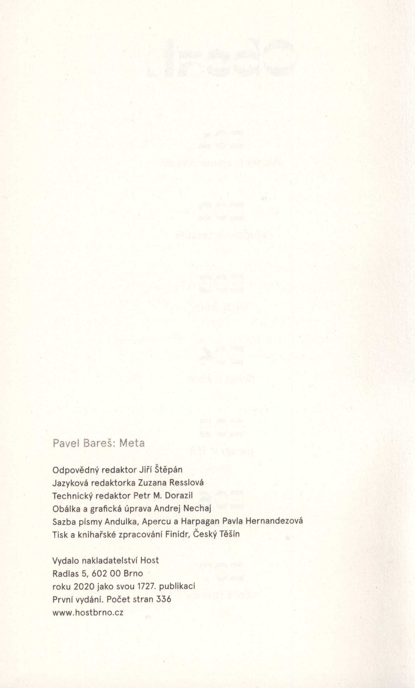 Title information Meta / Pavel Bareš ; obálka a grafická úprava Andrej Nechaj Personal name Bareš, Pavel, 1994- (Author) Další autoři Nechaj, Andrej, 1984- (Bookjacket designer) (Book designer) Corporation Host (nakladatelství) (Publisher) Finidr (tiskárna) (Printer) Edition statement První vydání Publication Brno : Host, 2020 Manufacture Český Těšín : Finidr Scope 333 stran ; 21 cm ISBN 978-80-275-0242-4 (brožováno) Country Czech Republic Language Czech Note Zdobená barevná obálka. - Na vnitřní straně přední obálky anotace. - Graficky zdobený dvoubarevný patitul. - Rozložený, zdobený tónovaný titulní list. - Grafický zdobený černobílý list s textem v úvodu jednotlivých kapitol. - Na zadní straně obálky ukázka z knihy.