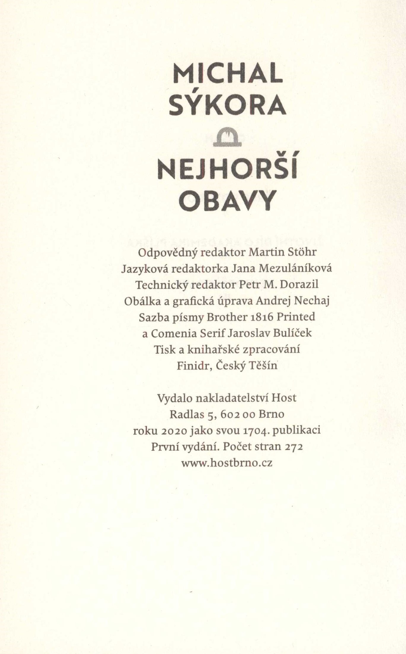 Title information Nejhorší obavy / Michal Sýkora ; obálka a grafická úprava Andrej Nechaj Personal name Sýkora, Michal, 1971- (Author) Další autoři Nechaj, Andrej, 1984- (Bookjacket designer) (Book designer) Corporation Host (nakladatelství) (Publisher) Finidr (tiskárna) (Printer) Edition statement První vydání Publication Brno : Host, 2020 Manufacture Český Těšín : Finidr Scope 269 stran ; 21 cm ISBN 978-80-275-0177-9 (vázáno) Country Czech Republic Language Czech Note Zdobená barevná obálka. - Zdobená tónovaná vazba. - Na záložkách obálky anotace a bio-bibliografická poznámka o autorovi s fotem. - Hnědé předsádky. - Zdobený dvoubarevný patitul. - Rozložený, zdobený tónovaný titulní list. - Ediční poznámka. - Na zadní straně obálky ukázka z knihy.