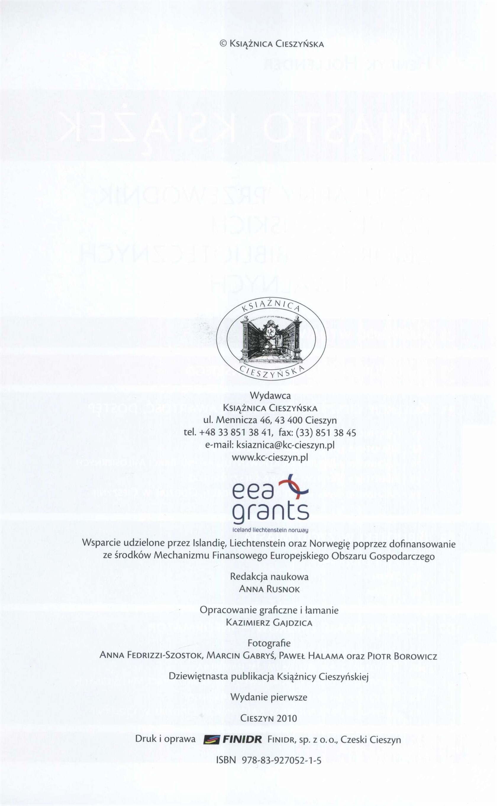 Title information Miasto książek : popularny przewodnik po cieszyńskich zbiorach bibliotecznych i archiwalnych / Henryk Hollender Personal name Hollender, Henryk (Author) Další autoři Książnica Cieszyńska (knihovna) (Publisher) Finidr (tiskárna) (Printer) Edition statement Wydanie pierwsze Publication Czieszyn : Książnica Cieszyńska, 2010 Manufacture Czeski Cieszyn : FINIDR, sp. z o.o. Scope 119 stran : ilustrace, fotografie, faksimile ; 24 cm ISBN 978-83-927052-1-5 (brožováno) Country Poland Language Polish Note Zdobená barevná obálka s barevnými fotografiemi, barevný text. - Obsah. - Údaje tiráže. - Úvodní slovo ředitele knihovny. - Barevné ilustrace, faksimile, fotografie s popisky. - Umístění sbírek. - Barevné fotografie na zadní straně obálky.