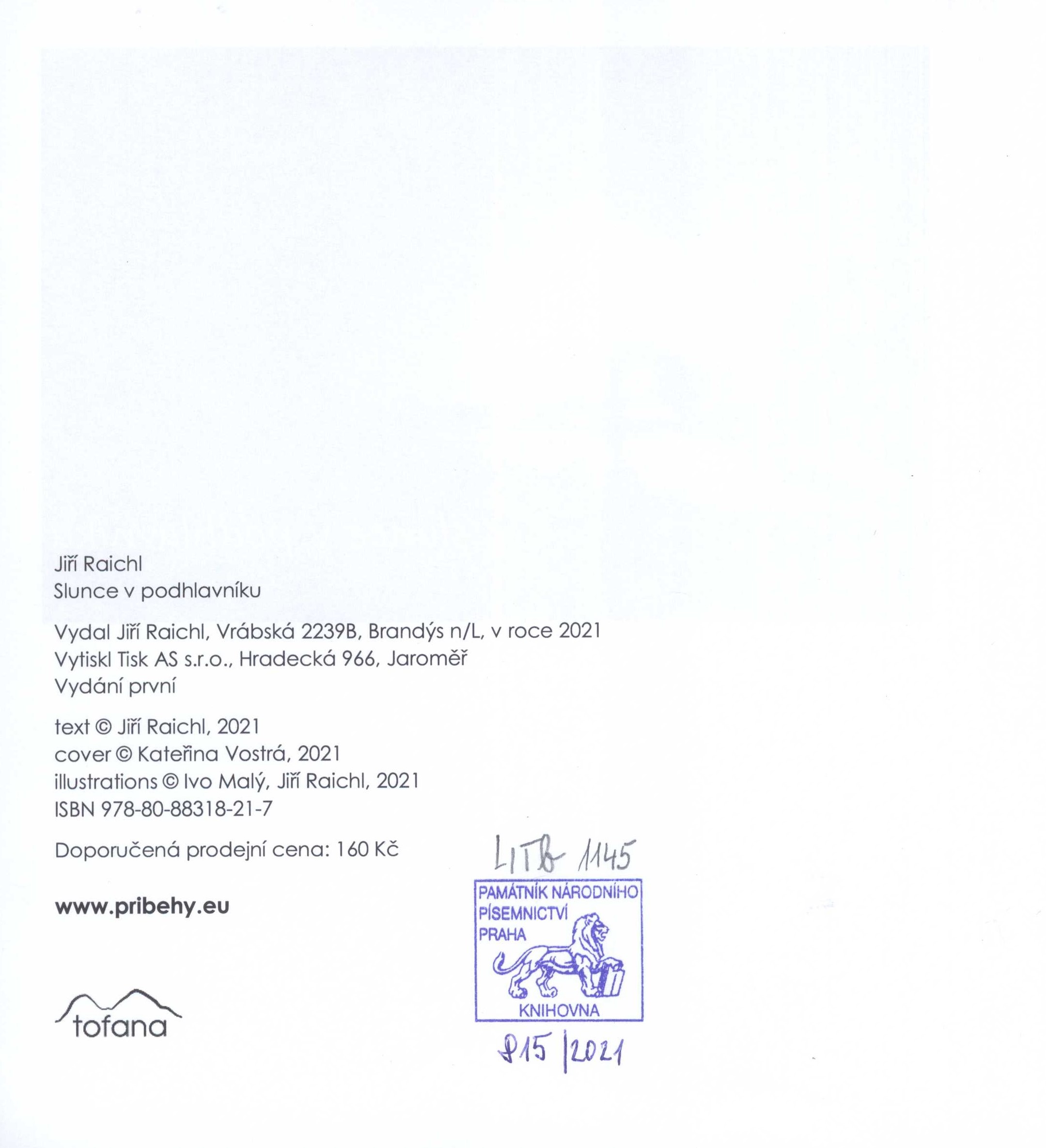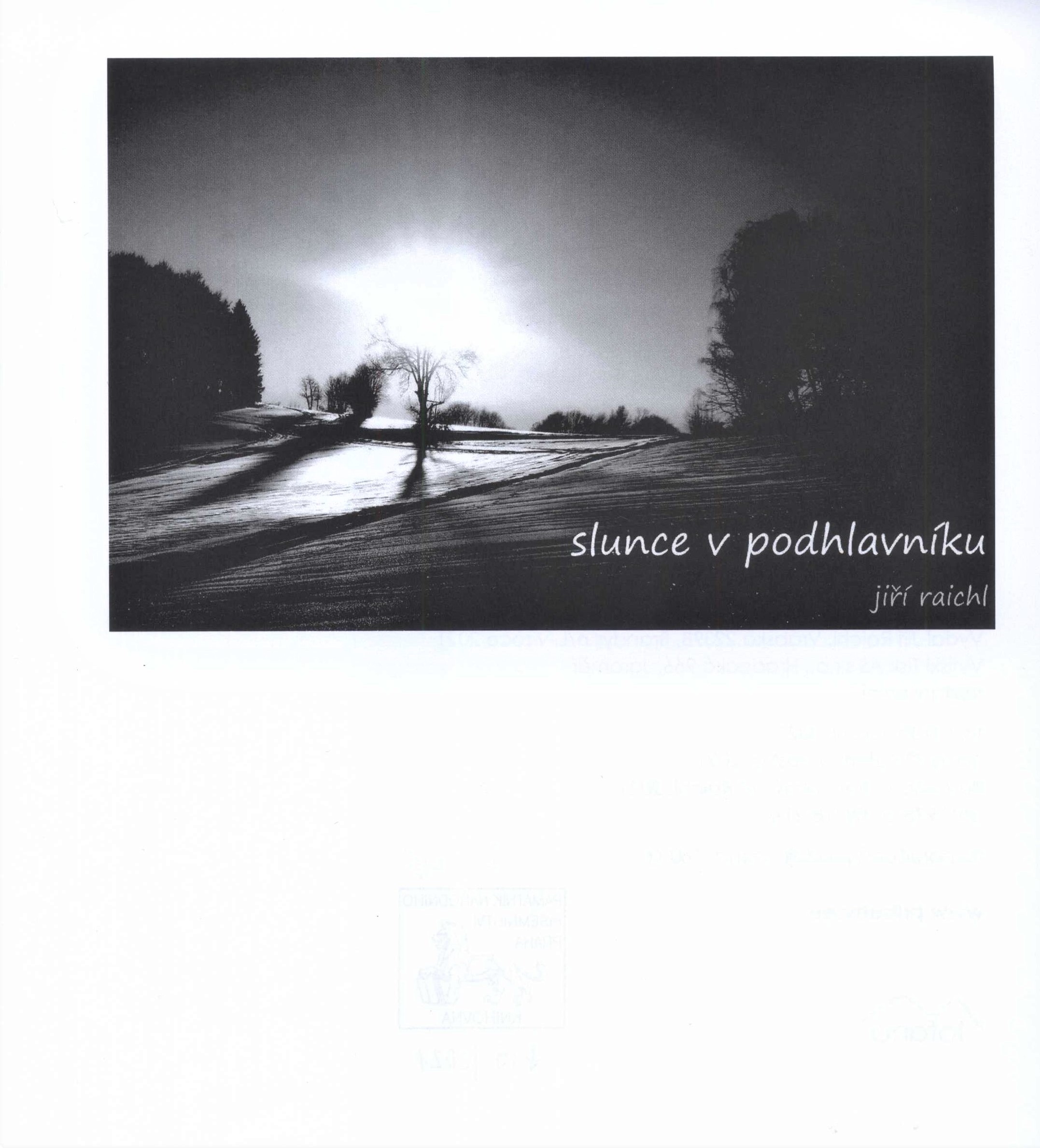 Title information Slunce v podhlavníku / Jiří Raichl ; obálka Kateřina Vostrá ; ilustrace Ivo Malý, Jiří Raichl Personal name Raichl, Jiří, 1966- (Author) (Illustrator) (Author of afterword, colophon, etc.) Další autoři Vostrá, Kateřina (Bookjacket designer) Malý, Ivo (Photographer) Corporation TOFANA (nakladatelství) (Publisher) Tisk AS, s.r.o. (tiskárna) (Printer) Edition statement Vydání první Publication Brandýs n/L : Tofana, 2021 Manufacture Jaroměř : Tisk AS s.r.o. Scope 81 stran : ilustrace ; 21 cm ISBN 978-80-88318-21-7 (brožováno) Country Czech Republic Language Czech Note Na obálce černobílá fotografie, bílý text. - Černobílá fotografie na titulním listu. - Údaje tiráže a copyrighty na rubu titulního listu. - Jednotlivé části (básně). - Černobílé fotografie, koláže (i celostránkové). - Doslov "Pár slov do mlhy, větru a deště" od autora. - Obsah. - Upoutávky na další knihy nakladatelství. - Internetové odkazy. - Anotace knihy a stručná biografie autora na zadní straně obálky.
