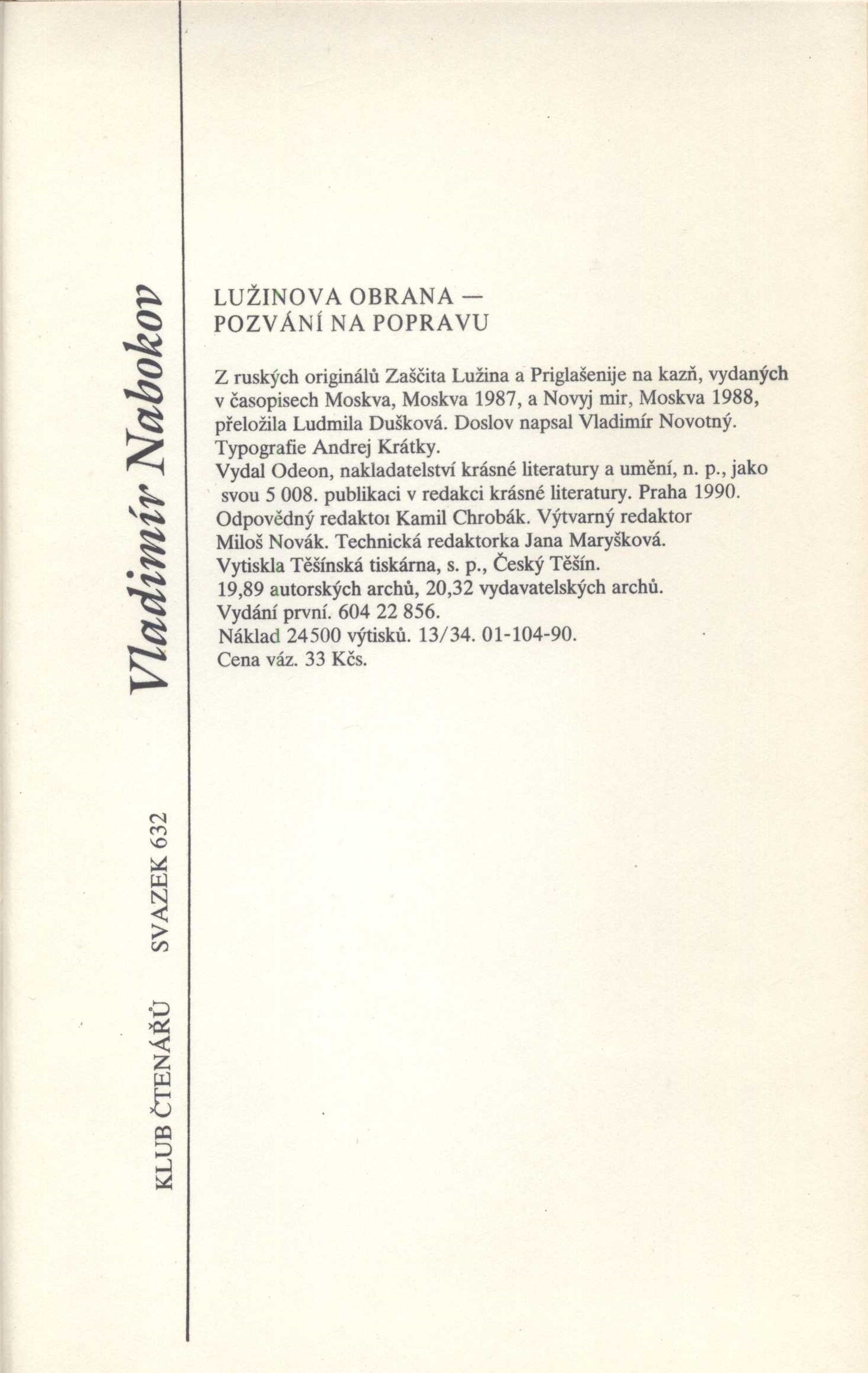 Klub čtenářů, (Odeon)Country Czech Republic Language Czech Language of the original Russian Note Doslov napsal Vladimír Novotný