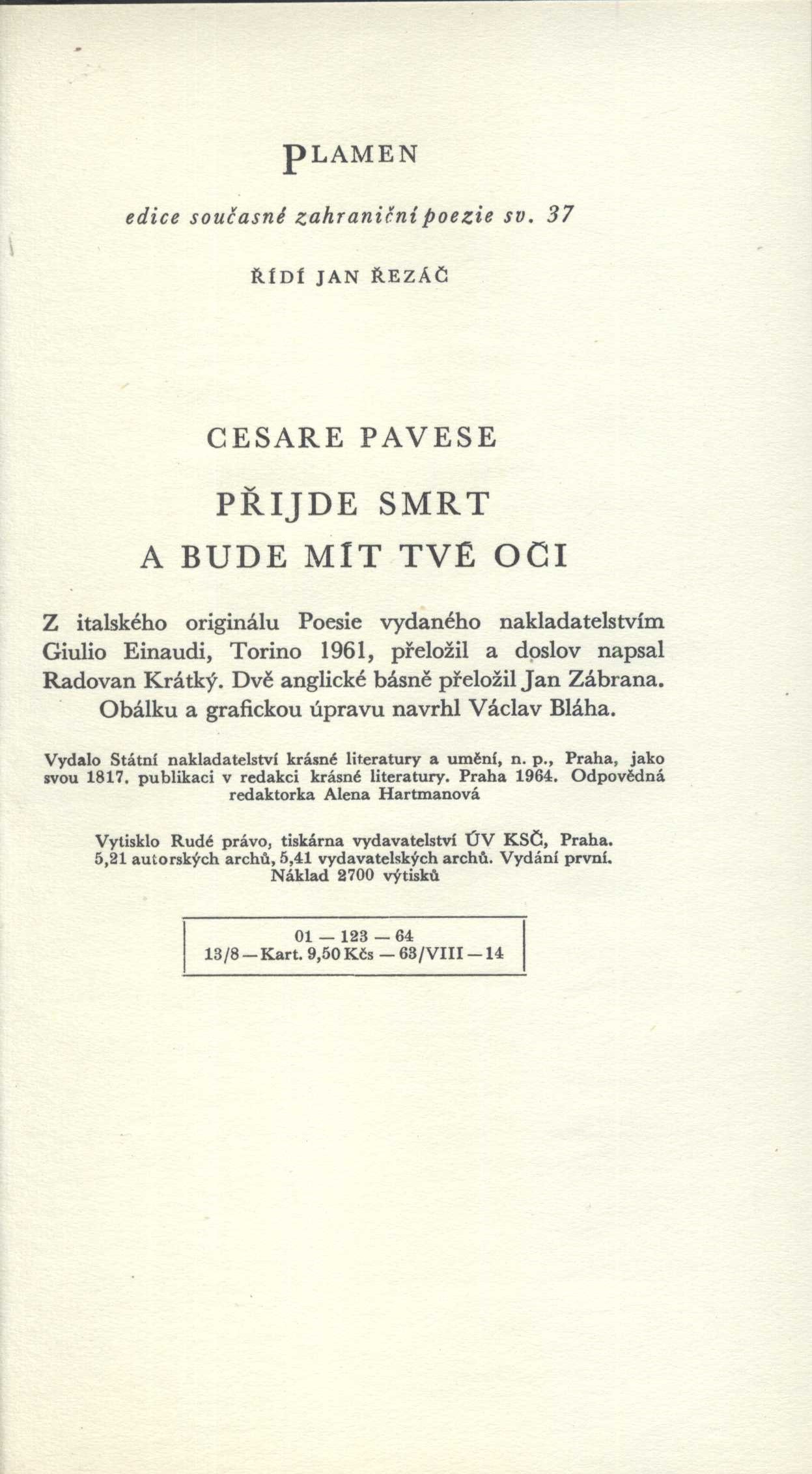 Title information Přijde smrt a bude mít tvé oči / Cesare Pavese ; z italského originálu Poesie přeložil a doslov napsal Radovan Krátký ; dvě anglické básně přeložil Jan Zábrana Personal name Pavese, Cesare, 1908-1950 (Author) Další autoři Krátký, Radovan, 1921-1973 (Translator) (Author of afterword, colophon, etc.) Zábrana, Jan, 1931-1984 (Translator) Bláha, Václav, 1922-2021 (Bookjacket designer) Corporation Státní nakladatelství krásné literatury a umění (Publisher) Rudé právo (tiskárna, Praha) (Printer) Edition statement Vydání první Publication Praha : Státní nakladatelství krásné literatury a umění 1964 Manufacture Praha : Rudé právo, tiskárna vydavatelství ÚV KSČ Scope 155 stran, 1 nečíslovaný list obrazové přílohy : fotografie ; 20 cm ISBN (Brožováno) Edition Plamen, edice současné zahraniční poezie ; sv. 37