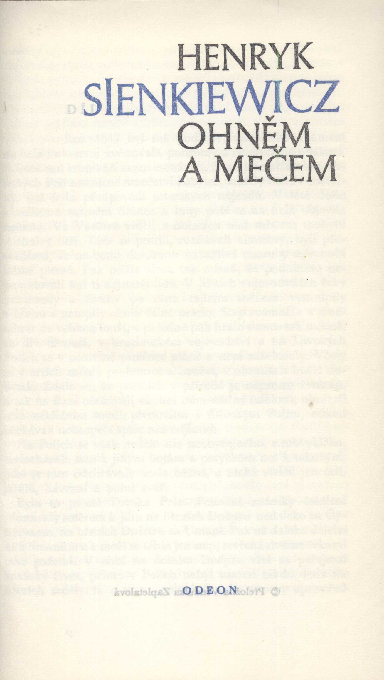 Title information Ohněm a mečem / Henryk Sienkiewicz ; z polského originálu Ogniem i mieczem ... přeložila Vendulka Zapletalová Personal name Sienkiewicz, Henryk, 1846-1916 (Author) Uniform title Ogniem i mieczem. Česky Další autoři Krasnický, Roman (Author of afterword, colophon, etc.) (Commentator) Zapletalová, Vendulka, 1917- (Translator) Hegar, Milan, 1921-1987 (Bookjacket designer) (Binding designer) (Book designer) Corporation Odeon (nakladatelství) (Publisher) Rudé právo (tiskárna, Praha) (Printer) Edition statement Vydání šestnácté, v Odeonu druhé Publication Praha : Odeon, 1986 Manufacture Praha : Rudé právo, tiskařské závody Scope 786 stran ; 21 cm ISBN (Vázáno) Edition Klub čtenářů ; svazek 551