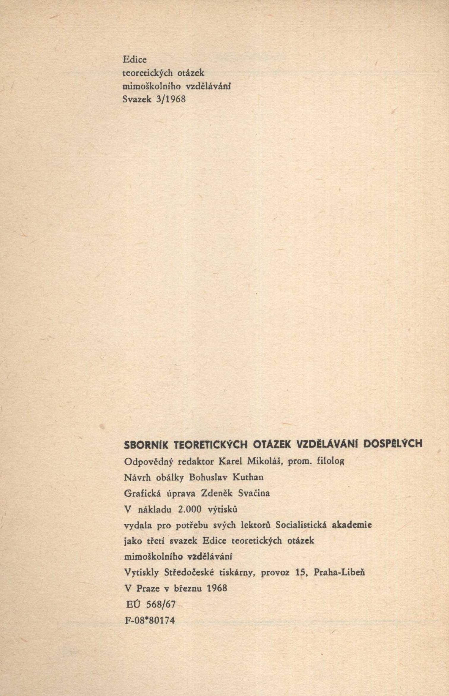 Title information Sborník teoretických otázek vzdělávání dospělých / odpovědný redaktor Karel Mikoláš ; návrh obálky Bohuslav Kuthan ; grafická úprava Zdeněk Svačina Další autoři Mikoláš, Karel (Editor) Kuthan, Bohuslav (Bookjacket designer) Svačina, Zdeněk (Book designer) Corporation Socialistická akademie (vydavatelství, nakladatelství) (Publisher) Středočeské tiskárny, n. p. (Praha) (Printer) Issue data Praha : Socialistická akademie, 1968 Publication Praha : Socialistická akademie, 1968 Manufacture Praha-Libeň : Středočeské tiskárny, provoz 15 Scope 255 stran ; 21 cm Keywords česká literatura * sborník * vzdělávání dospělých * mimoškolní vzdělávání * andragogika * Česko * r. 1968 Copy cnt. 1, currently available 1 Document kind monografie Call number MUK 2115
