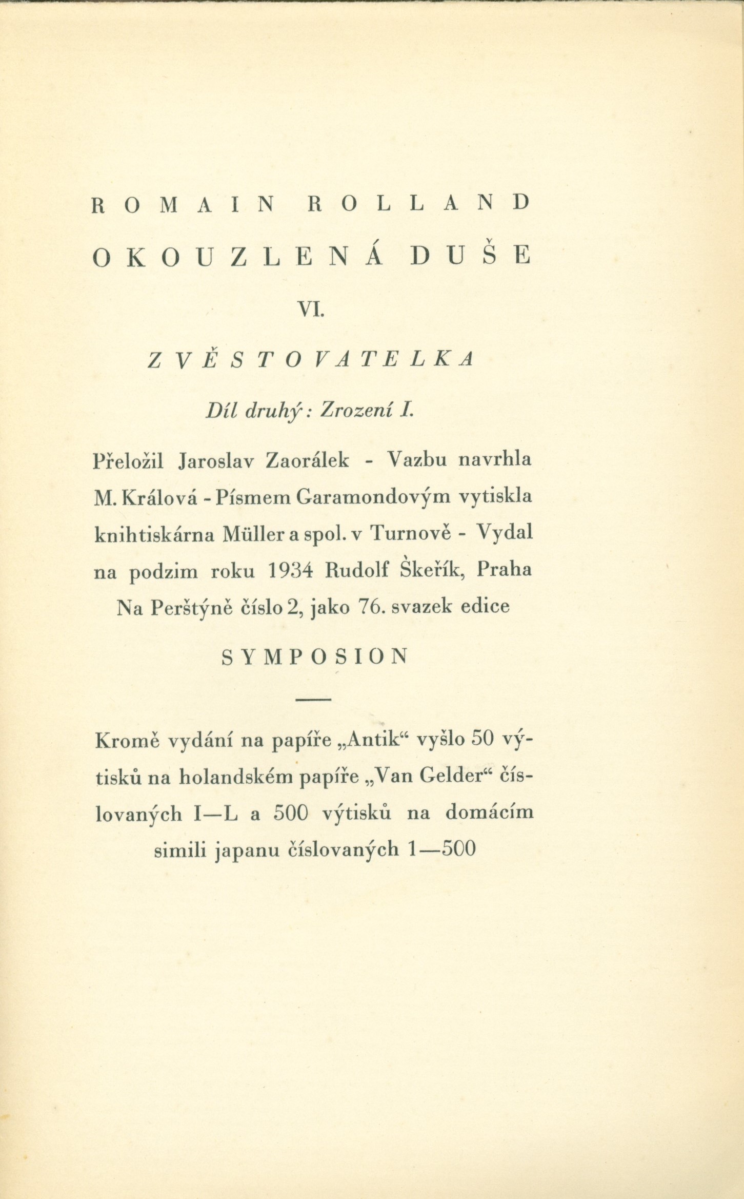 $a 76. svazek edice Symposion 500 $a Vazbu navrhla M. Králová 500 $a Přeloženo z francouzštiny 500 $a Část nákladu brož. 500 $a Kromě vydání na papíře Antik vyšlo 50 výtisků na holandském papíře Van Gelder číslovaných I-L a 500 výtisků na domácím simili japanu číslovaných 1-500 550 $a V tiráži: "Vydal na podzim roku 1934 Rudolf Škeřík ... jako 76. svazek edice Symposion" 653 1-