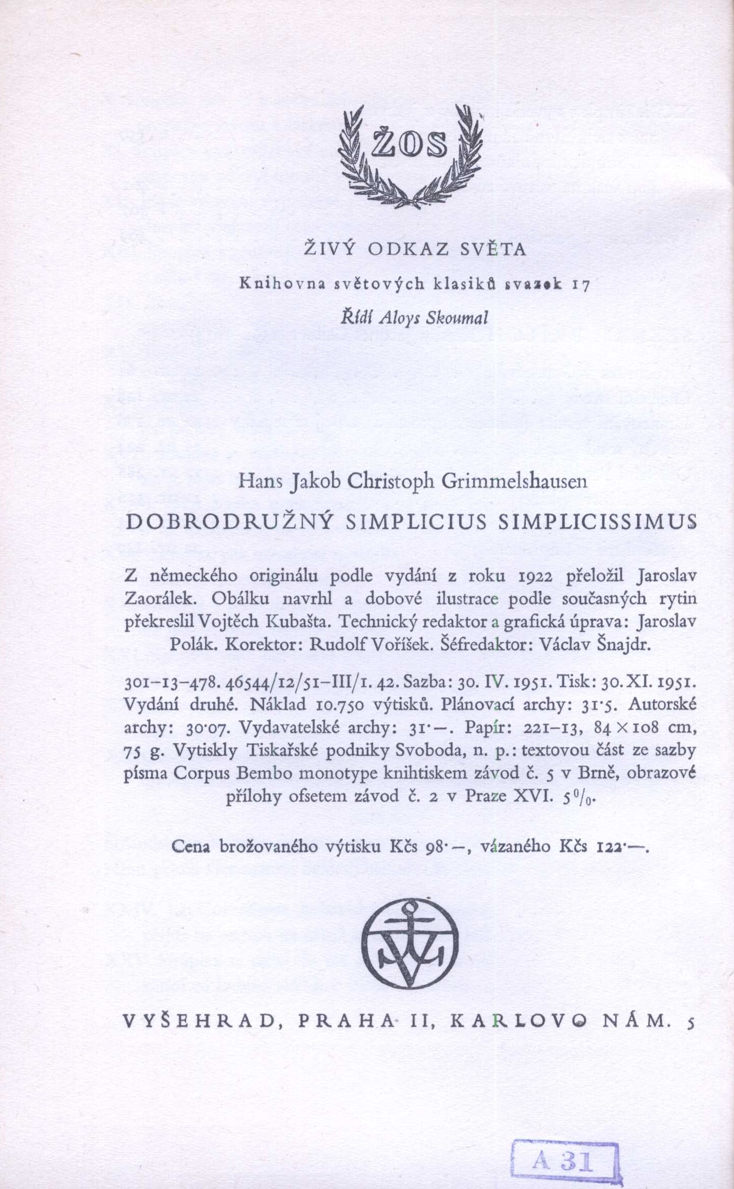 Živý odkaz světa, Knihovna světových klasiků, (Vyšehrad)Country Czech Republic Language Czech Language of the original German Note Obálku navrhl a dobové ilustrace podle současných rytin překreslil Vojtěch Kubašta