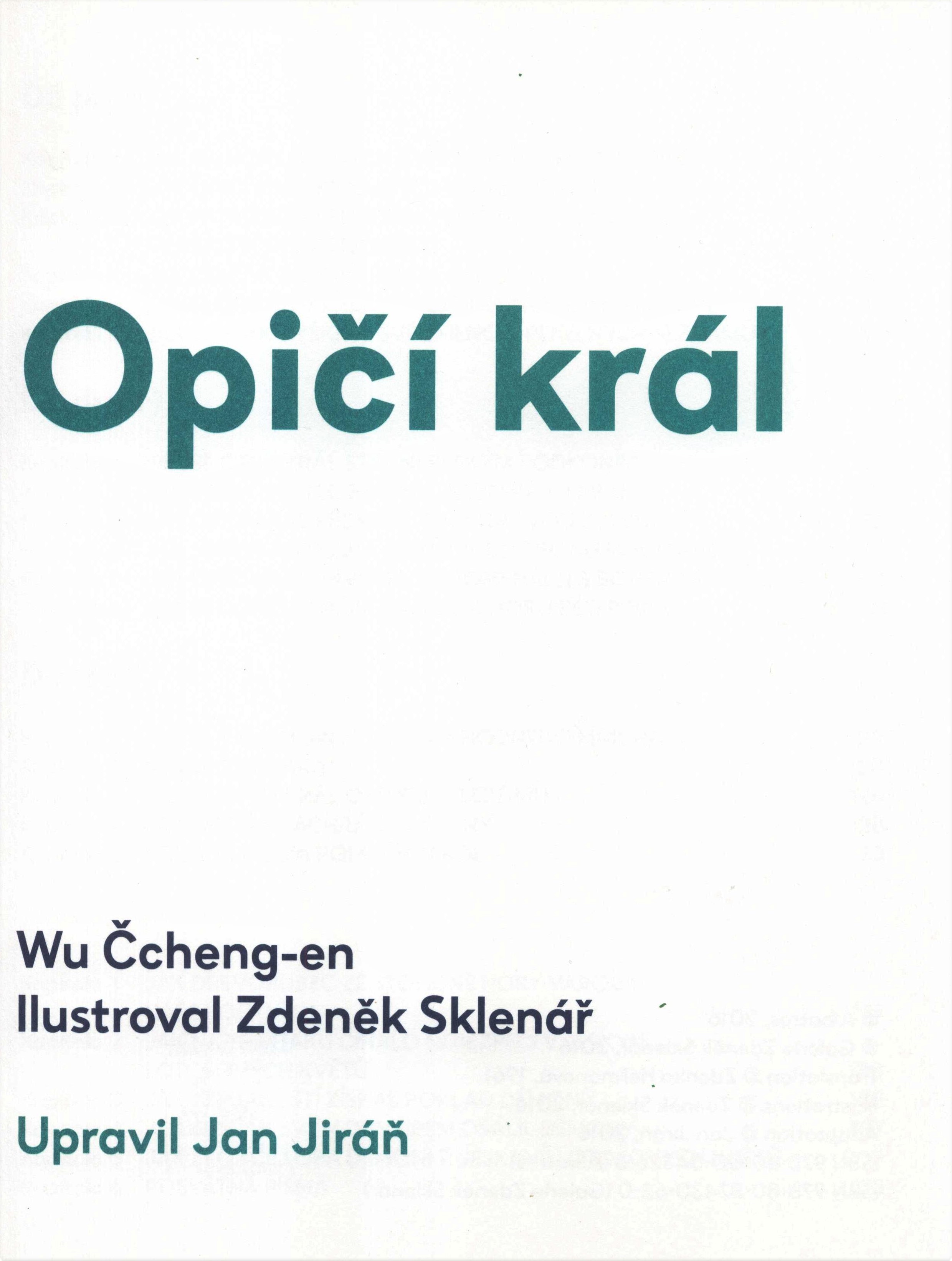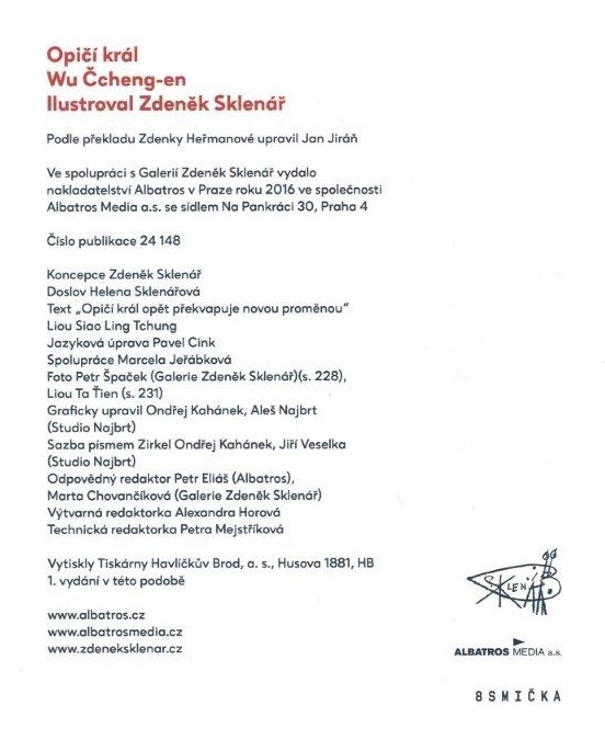 Title information Opičí král / Wu Čcheng-en ; ilustroval Zdeněk Sklenář ; upravil Jan Jiráň ; přeložila Zdenka Heřmanová ; graficky upravil Ondřej Kahánek, Aleš Najbrt (Studio Najbrt) Personal name Wu, Cheng'en, asi 1500-1582 (Author) (Bibliographic antecedent) Další autoři Sklenář, Zdeněk, 1910-1986 (Illustrator) (Conceptor) Heřmanová, Zdenka, 1930-2024 (Translator) Jiráň, Jan, 1957- (Adapter) Kahánek, Ondřej, 1989- (Book designer) (Compositor) Najbrt, Aleš, 1962- (Book designer) (Compositor) Corporation Nakladatelství Albatros (Publisher) Galerie Zdeněk Sklenář (Praha, Česko) (Publisher) Tiskárny Havlíčkův Brod (firma) (Printer) Edition statement 1. vydání v této podobě Publication Praha : Albatros : Galerie Zdeněk Sklenář, 2016 Manufacture Havlíčkův Brod : Tiskárny Havlíčkův Brod, a.s. Scope 225 stran : barevné ilustrace ; 30 cm ISBN 978-80-00-04326-5 (Albatros ; vázáno) 978-80-87430-62-0 (Galerie Zdeněk Sklenář ; vázáno) Country Czech Republic Language Czech Language of the original Chinese Note Červená vazba s oranžovou ilustrací, bílý text (i na hřbetu). - Barevné ilustrované předsádky. - Barevná ilustrace, nakladatelské značky na vakátě. - Frontispis. - Barevný text na titulním listu. - Obsah. - Barevný text (různé typy písma). - Barevné celostránkové ilustrace. - Doslov H. Sklenářová. - Text "Opičí král opět překvapuje novou proměnou" Liou Siao Ling Tchung. - Tónované fotografie Liou Siao Ling Tchung (*1959, čínský herec). - Anotace knihy na zadní straně vazby.