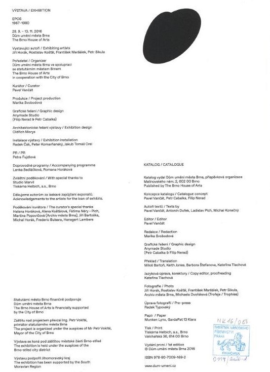 Title information Epos : 1967-1980 / autoři textů Pavel Vančát, Antonín Dufek, Ladislav Plch, Michal Konečný ; editor Pavel Vančát ; grafické řešení Anymade Studi (Petr Cabalka & Filip Nerad) ; Main entry-corp. Epos (umělecká skupina) (Artist) Další autoři Vančát, Pavel, 1976- (Conceptor) (Author) (Editor) Dufek, Antonín, 1943-2023 (Author) Plch, Ladislav, (Author) 1945- Konečný, Michal, 1982- (Author) Cabalka, Petr, 1979- (Book designer) Nerad, Filip, 1977- (Book designer) Corporation Dům umění města Brna (galerie) (Organizer of meeting) Tiskárna Helbich (Printer) Další var.názvy Epos Preludium Four Phptographers Edition statement Vydání první Publication Brno : Dům umění města Brna, [2016] Manufacture Brno : Tiskárna Helbich, a.s. Copyright notice date ©2016 Scope 229 stran : ilustrace (některé barevné), faksimile ; 31 cm ISBN 978-80-7009-169-2 (brožováno) Country Czech Republic Language Czech * English Language of the original Czech Note Název z obálky. - Bílá obálka (PVC materiál) s černobílými fotografiemi, černý text. - Černobílá celostránková fotografie. - Obsah. - Přehled fotografií jednotlivých autorů. - Texty. - Na křídovém papíře barevné fotografie (trofeje). - Drobnější i celostránkové černobílé fotografie s popisky. - Text M. Konečného. - Biografie autorů, přehled výstav a zastoupení ve sbírkách, reference, poznámka editora. - Faksimile. - Loga sponzorů. - Celostránková černobílá fotografie.
