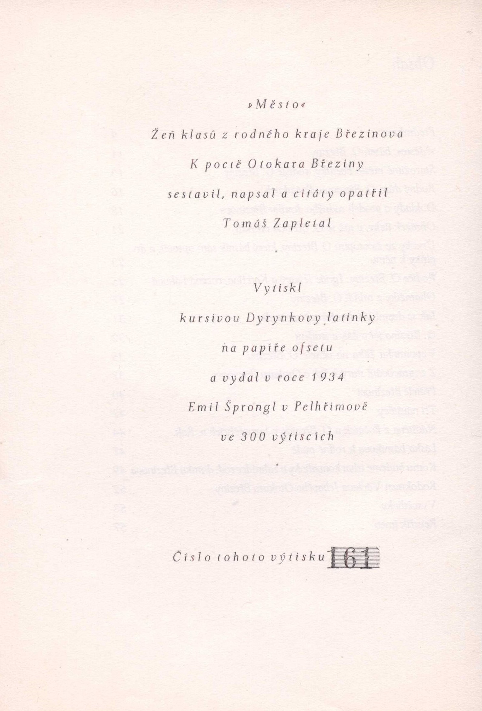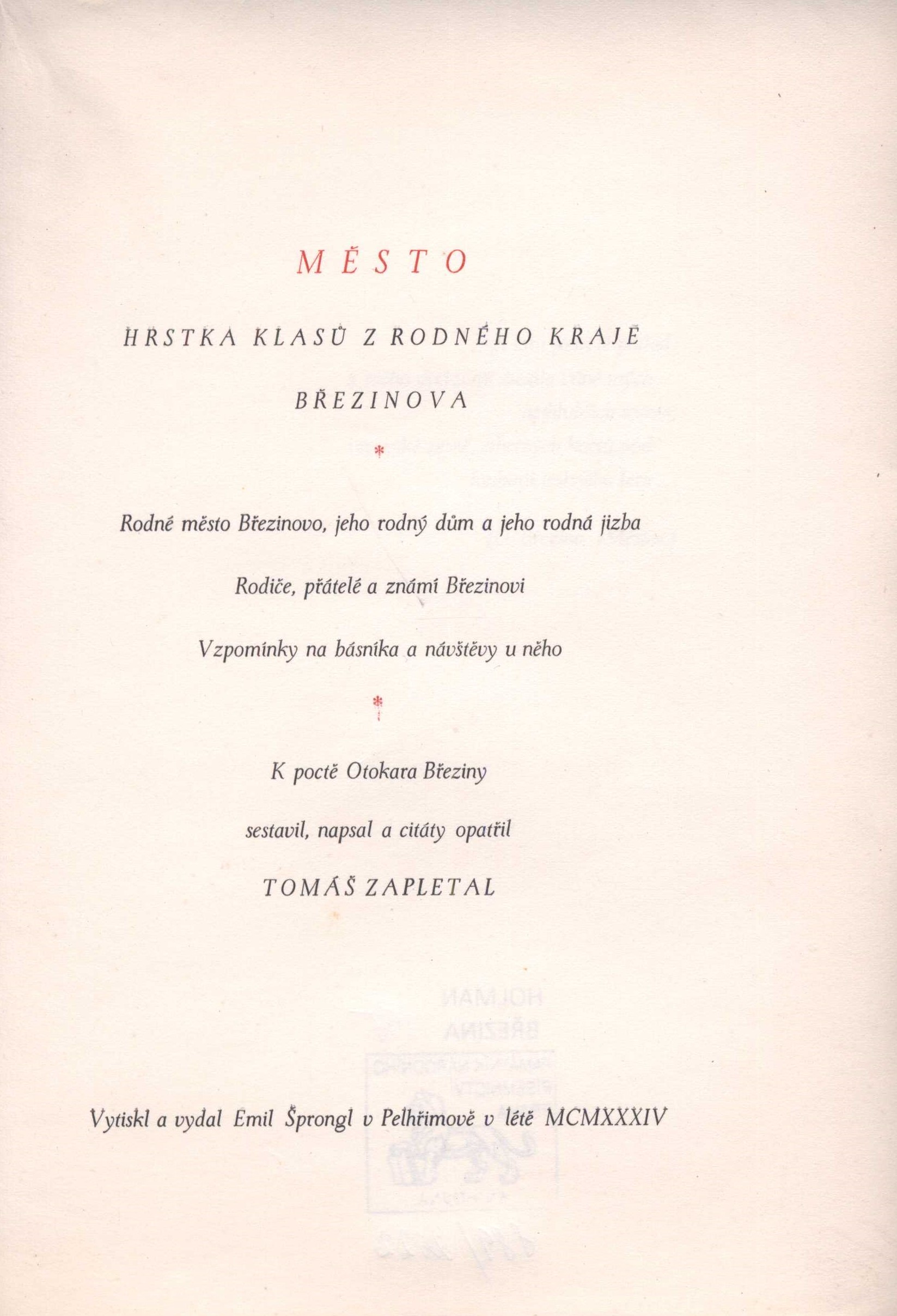 Title information Město : hrstka klasů z rodného kraje Březinova : rodné město Březinovo, jeho rodný dům a jeho rodná jizba - rodiče, přátelé a známí Březinovi - vzpomínky na básníka a návštěvy u něho / k poctě Otakara Březiny sestavil, napsal a citáty opatřil Tomáš Zapletal Další autoři Zapletal, Tomáš, 1881-1960 (Editor) Corporation Emil Šprongl (nakladatelství a knihtiskárna) (Publisher) (Printer) Publication V Pelhřimově : Emil Šprongl, 1934 Scope 56 stran ; 21,5 cm ISBN (Brožováno) Country Czech Republic Language Czech Note Typografická obálka. - Dvoubarevný titulní list. - Předmluva. - Vysvětlivky. - Obsahuje rejstřík. - 300 číslovaných výtisků na ofsetu. - Bibliofilie.