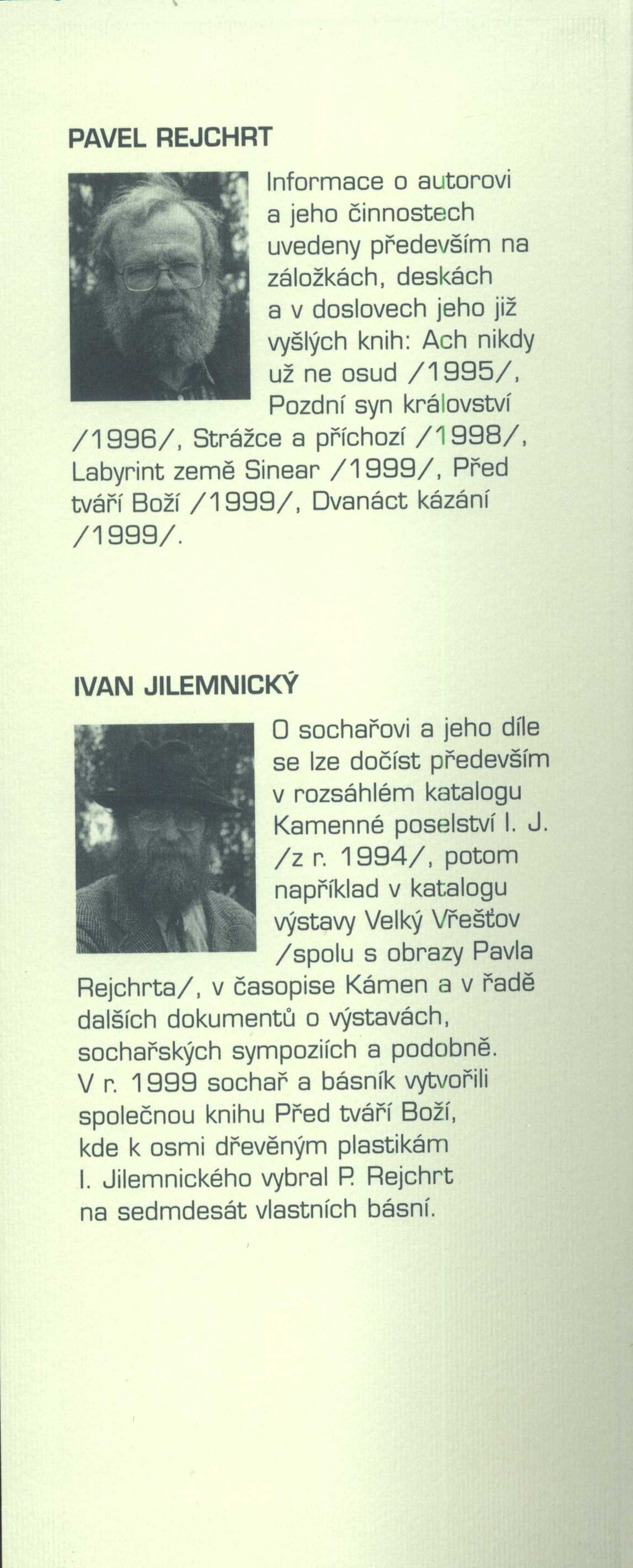 Rejchrt, Pavel, 1942- - malíř a grafik, restaurátor, básník, prozaik, teolog, překladatel * Jilemnický, Ivan, 1944-2012 - sochař, malíř, grafik, pedagog * moderní sochařství - Česko * české sochařství - 20. stol * Sculpture, Modern - Czechia - 20th century * Sculpture, Czech * česká literatura * próza * reflexivní próza * Rejchrt P. * výzdoba knihy * sochy * Jilemnický I. * r. 2000