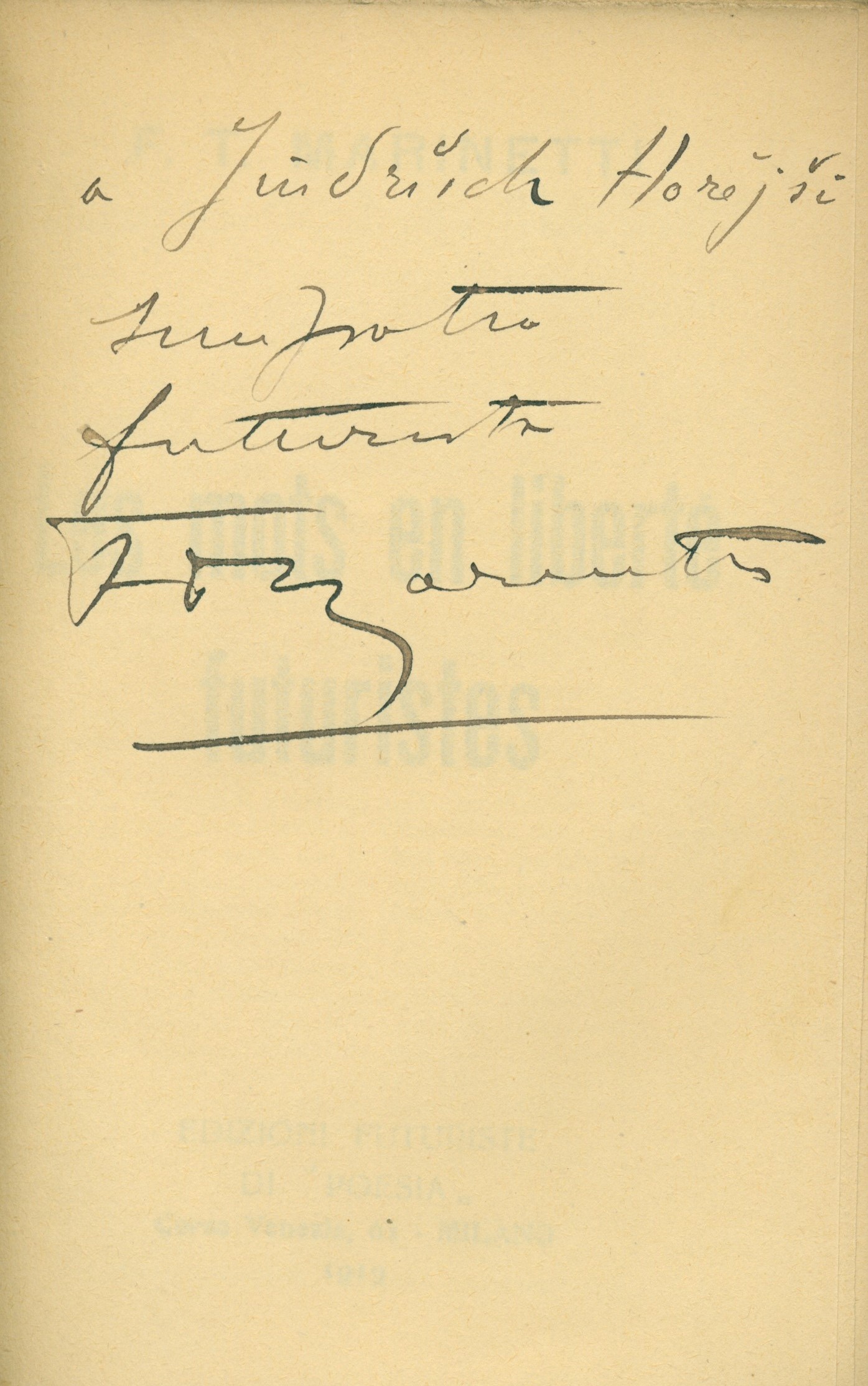 U sign. AHO (Archiv Hořejší) dedikace (černě, perem): "a Jindřich Hořejši" ... "T. F. Marinetti"