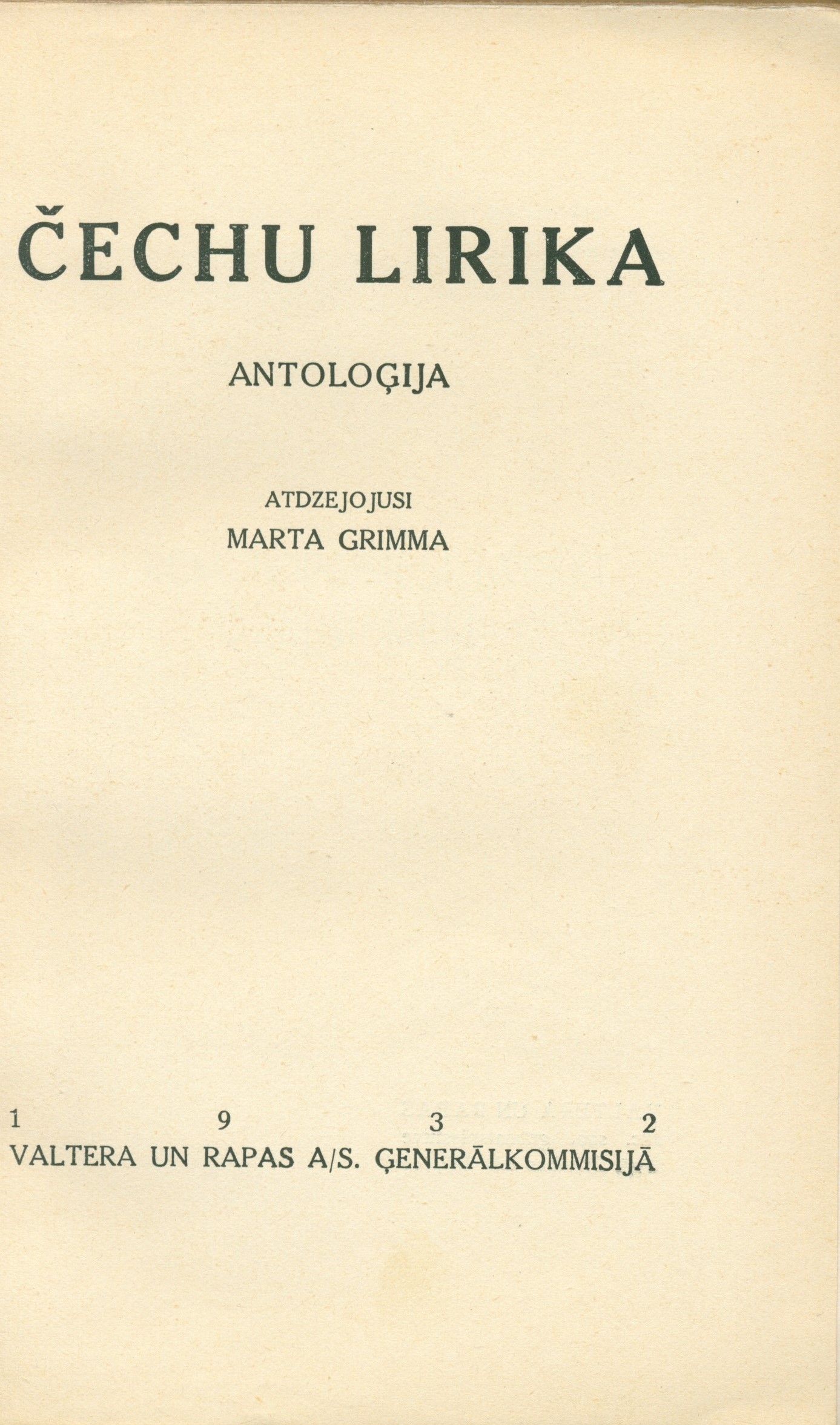 Title information Čechu lirika : antoloģija / atdzejojusi Marta Grimma Personal name Grimma, Marta, 1901-1983 (Compiler) (Translator) Další autoři Valtera un Rapas (nakladatelství) (Publisher) Publication Rīgā : Valtera un Rapas a/s., ģenerālkommisijā, 1932 Scope 160 stran, 2 nečíslované listy obrazové přílohy : portréty ; 21 cm ISBN (Brožováno) Country Latvia Language Latvian Language of the original Latvian * Czech Language note Text lotyšsky Document kind monografie Internal Bibliographies/Indexes Note Obsahuje bibliografii Keywords lotyšská literatura * čeští spisovatelé * čeští básníci * překlady básní * antologie * r. 1932 UDC 821.162.3-051 * 821.162.3-1 * =030 * (082.21) * 811.174 Uživatelské pole PNP U sign. AHO (Archiv Hořejší) - brožovaný výtisk. - Obálka s částečně zlaceným textem. - Vakát. - Mimo paginaci frontispis (portrét O. Březiny). - Titulní list. - Obrazová příloha na hlazeném papíru mimo paginaci (portréty). - Úvod autorky. - Literatura. - Životopisné poznámky. - Obsah. U sign. AHO (Archiv Hořejší) - obálka zašpiněná, místy ve hřbetu narušená a oddělená od knižního šitého bloku, zažloutlé listy nestejné délky s nerovnými kraji. Rozsah: 160, [2] l. obr. příl. Rozměr: 20,2 cm. Call number Track No. Location Info AHO 0403 1212/2022 Sbírka M 10 e 36 0880/63 Sbírka
