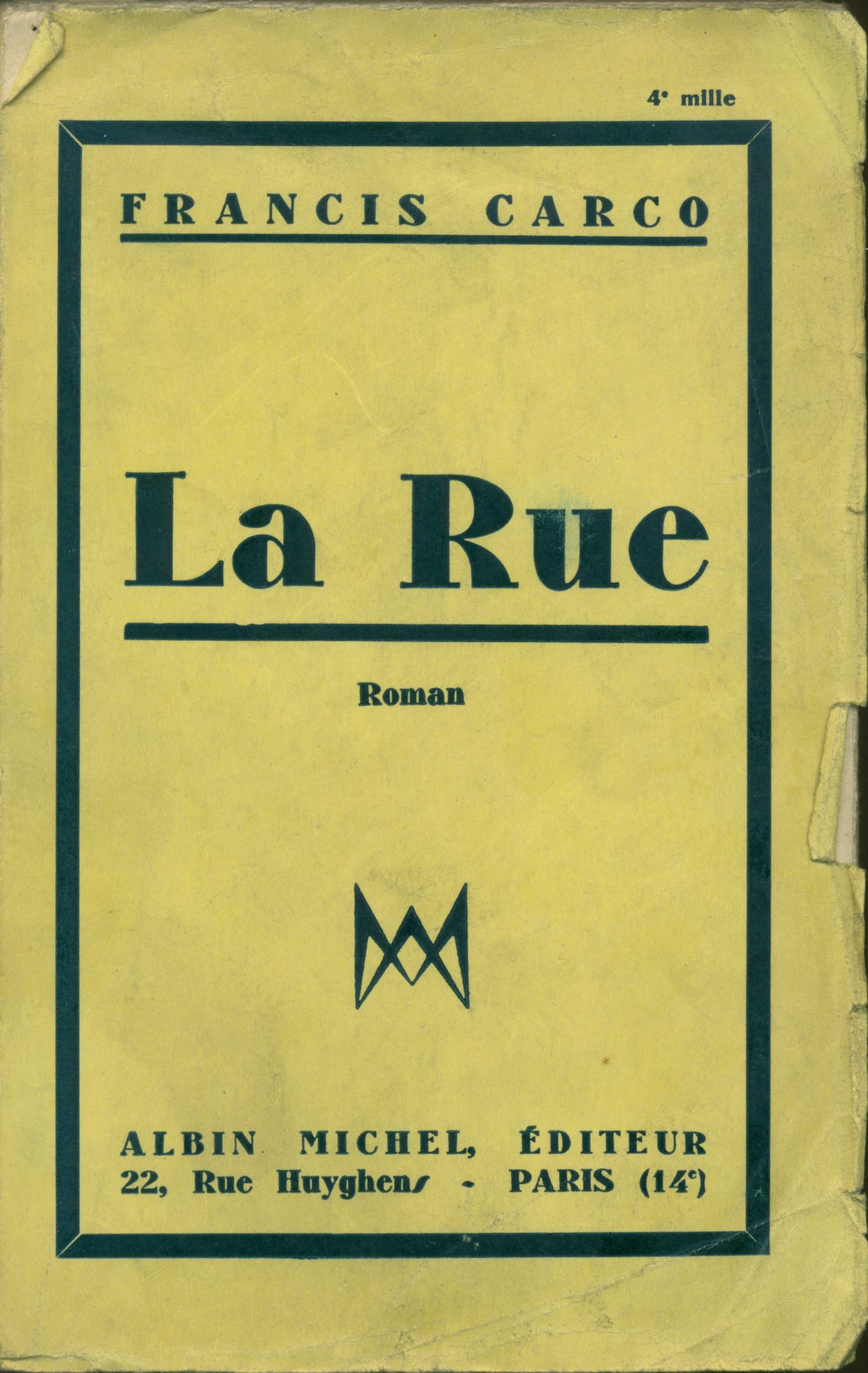 Title information La Rue : roman / Francis Carco Personal name Carco, Francis, 1886-1958 (Author) Další autoři Albin Michel (nakladatelství, Paříž, Francie) (Publisher) J. Dardaillon (Printer) Établissements Busson (tiskárna) (Printer) Edition statement 4e mille Publication Paris : Albin Michel, éditeur, 1930 Manufacture Saint-Denis : J. Dardaillon Scope 254 stran ; 19 cm ISBN (Brožováno) Country France Language French Note Vydání z obálky