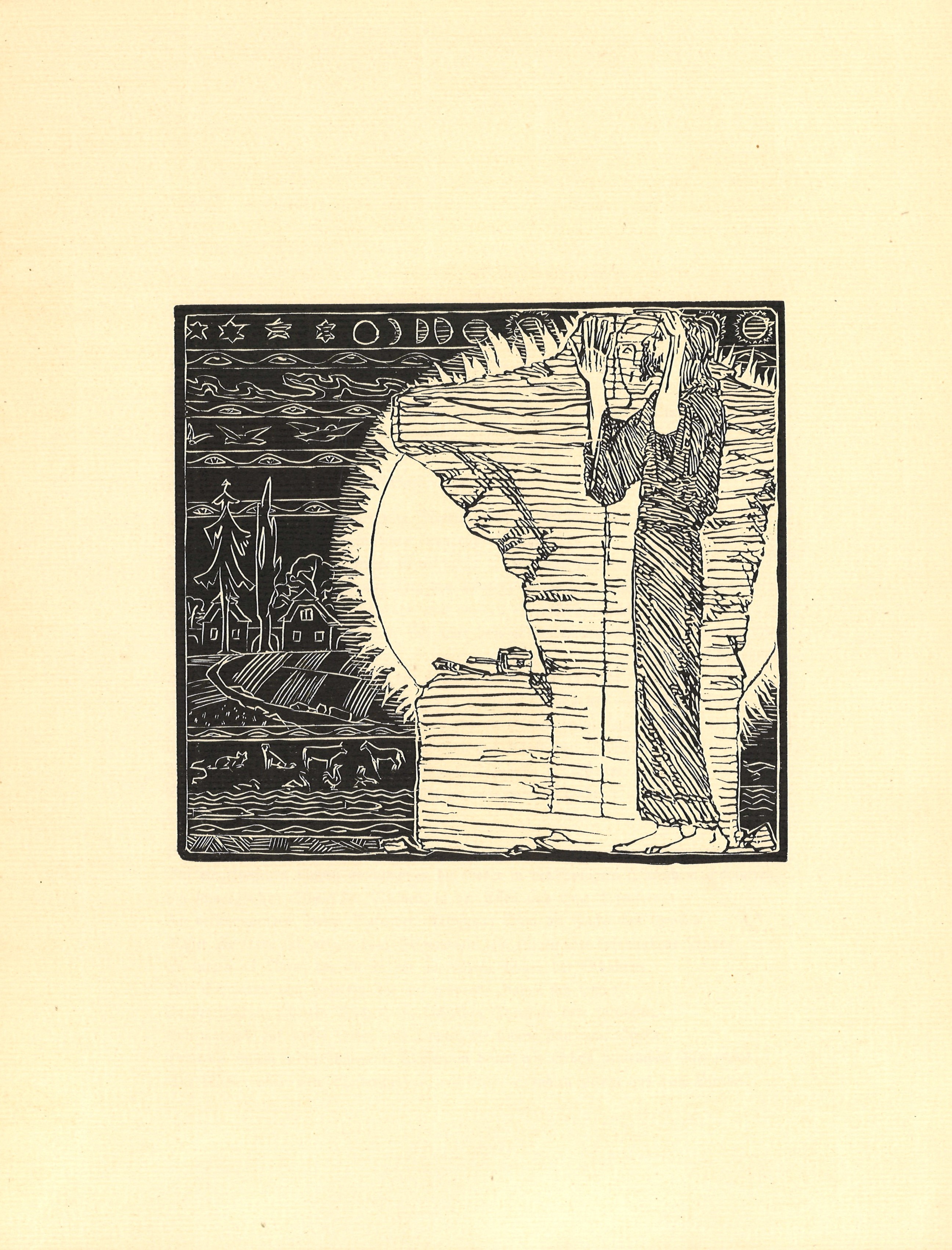 Sign. Holman-Březina 351: Knihovna Petra Holmana. - Brožovaný výtisk. - Na frontispisu pouze popisek, chybí vlepená podobizna autora. - Nalepené reprodukce ilustrací Františka Bílka chybí, v knize jen tištěné dřevoryty. - Na místě reprodukcí prázdné stránky. - Na patitulu rukopisná dedikace Emila Saudka dr. Františku Balejovi s podpisem a datací "18. října 1913". - Ve hřbetu knižní blok částečně oddělen od obálky.