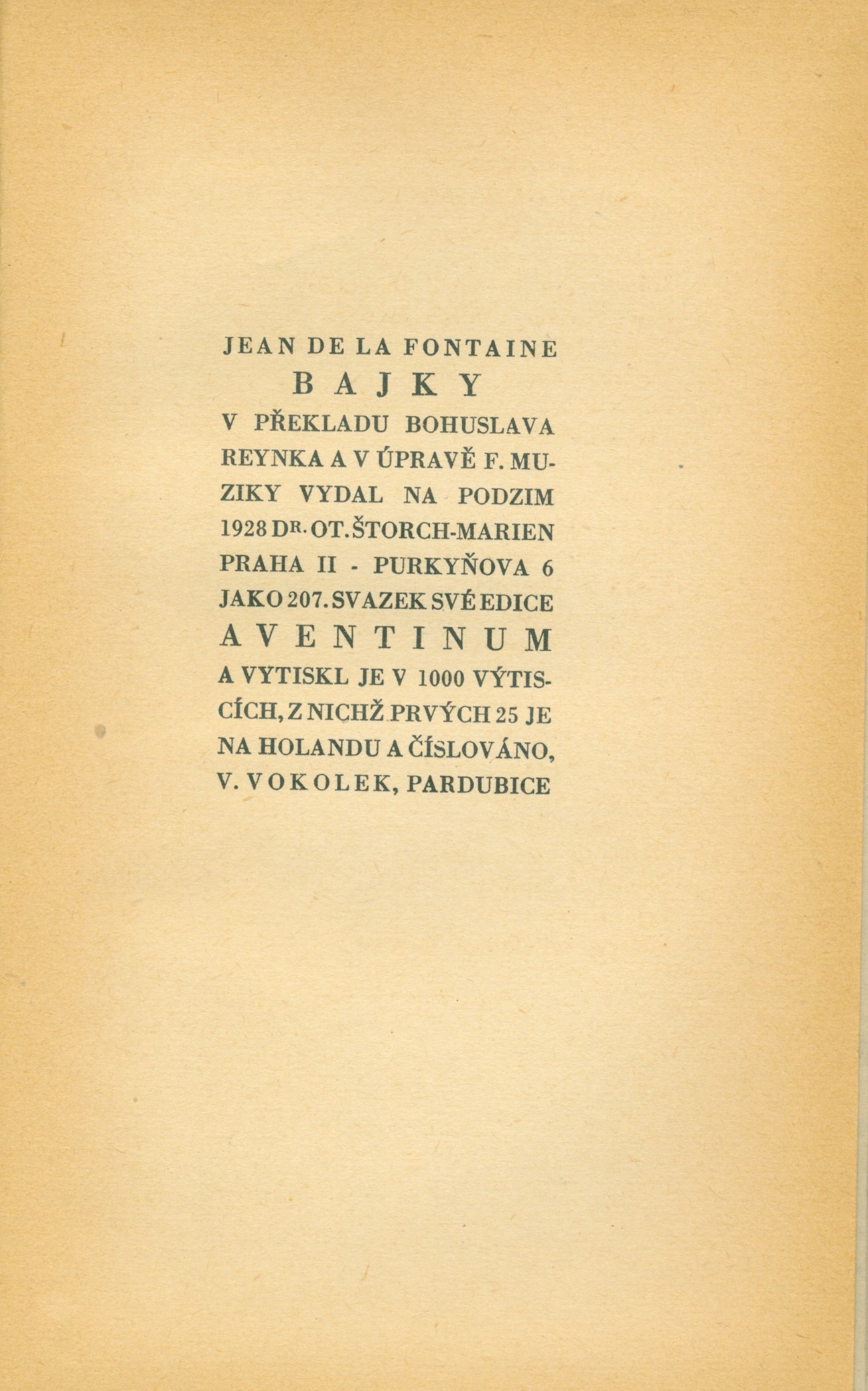 Title information Bajky / Jean de La Fontaine ; přeložil Bohuslav Reynek Personal name La Fontaine, Jean de, 1621-1695 (Author) Další autoři Reynek, Bohuslav, 1892-1971 (Translator) (Author of introduction) Muzika, František, 1900-1974 (Book designer) Hořejší, Jindřich, 1886-1941 (Dedicator) Šimsová, Růžena, 1899- (Dedicatee) Corporation Dr. Ot. Štorch-Marien (nakladatelství) (Publisher) Vokolek, Václav (tiskárna : Pardubice) (Printer) Publication Praha : Aventinum, Dr. Ot. Štorch-Marien, 1928 Manufacture Pardubice : V. Vokolek Scope 513 stran ; 19 cm ISBN (Vázáno) Edition 207. svazek ... edice Aventinum