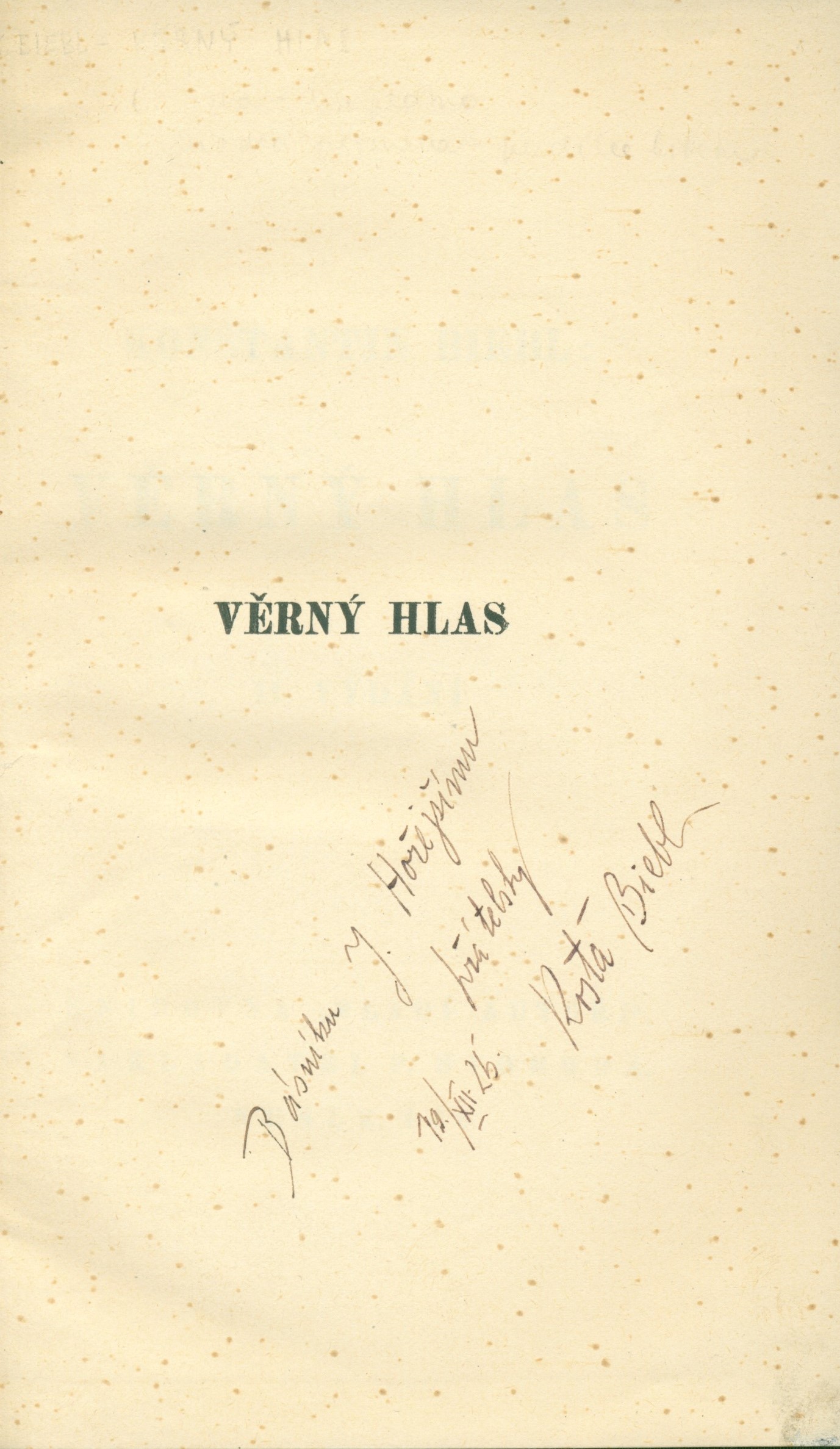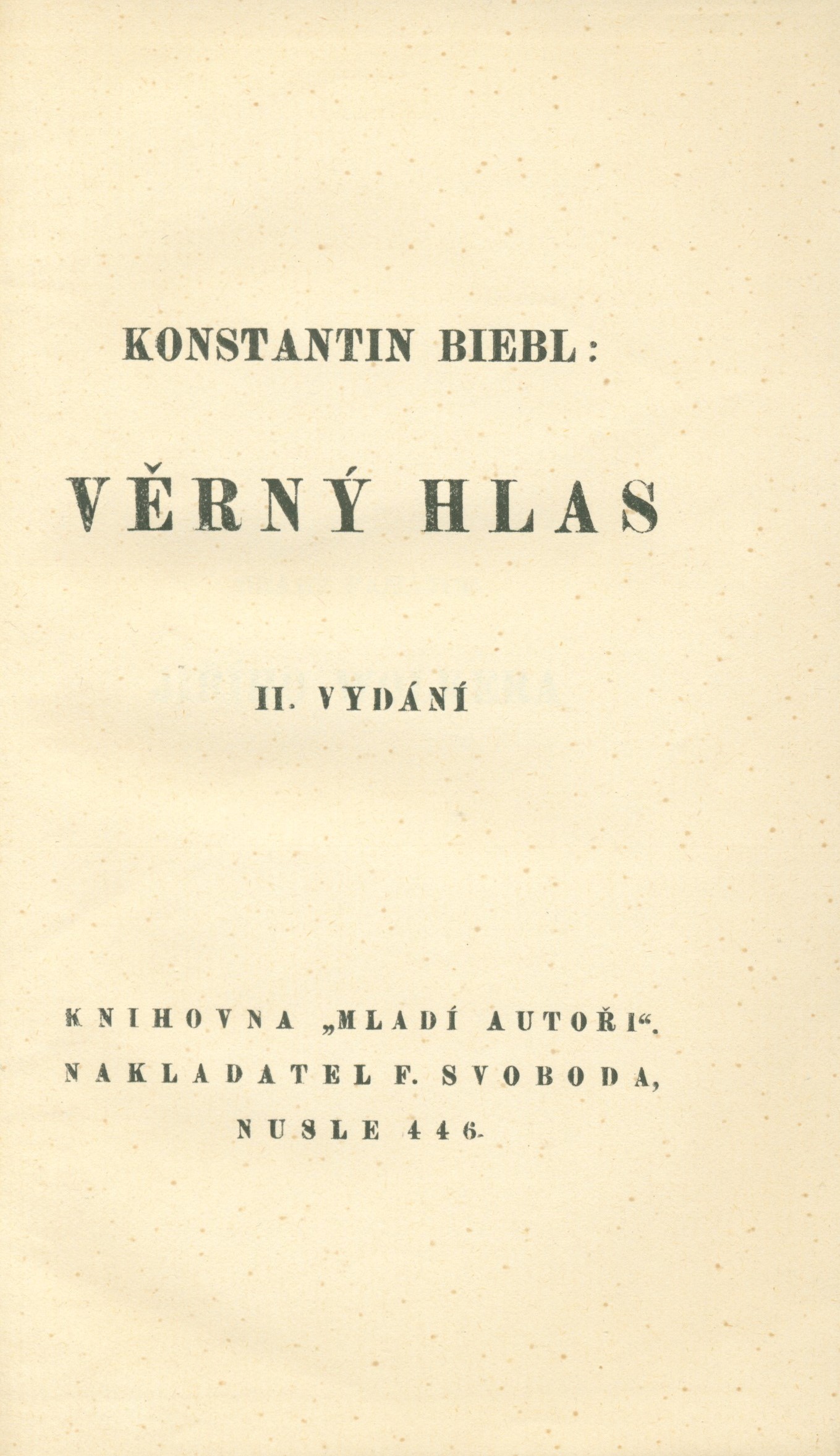 Title information Věrný hlas / Konstantin Biebl Personal name Biebl, Konstantin, 1898-1951 (Author) (Dedicator) (Inscriber) Další autoři Tittelbach, Vojtěch, 1900-1971 (Bookjacket designer) Hořejší, Jindřich, 1886-1941 (Dedicatee) Corporation F. Svoboda (nakladatelství) (Publisher) Palásek a Kraus (firma) (Printer) Edition statement II. rozšířené vydání Publication Nusle : Knihovna Mladí autoři, nakladatel F. Svoboda, 1925 Manufacture [Praha] : tiskaři V. Palásek a Fr. Kraus Scope 66 stran ; 21 cm ISBN (Vázáno) Edition 11. svazek knihovny Mladí autoři