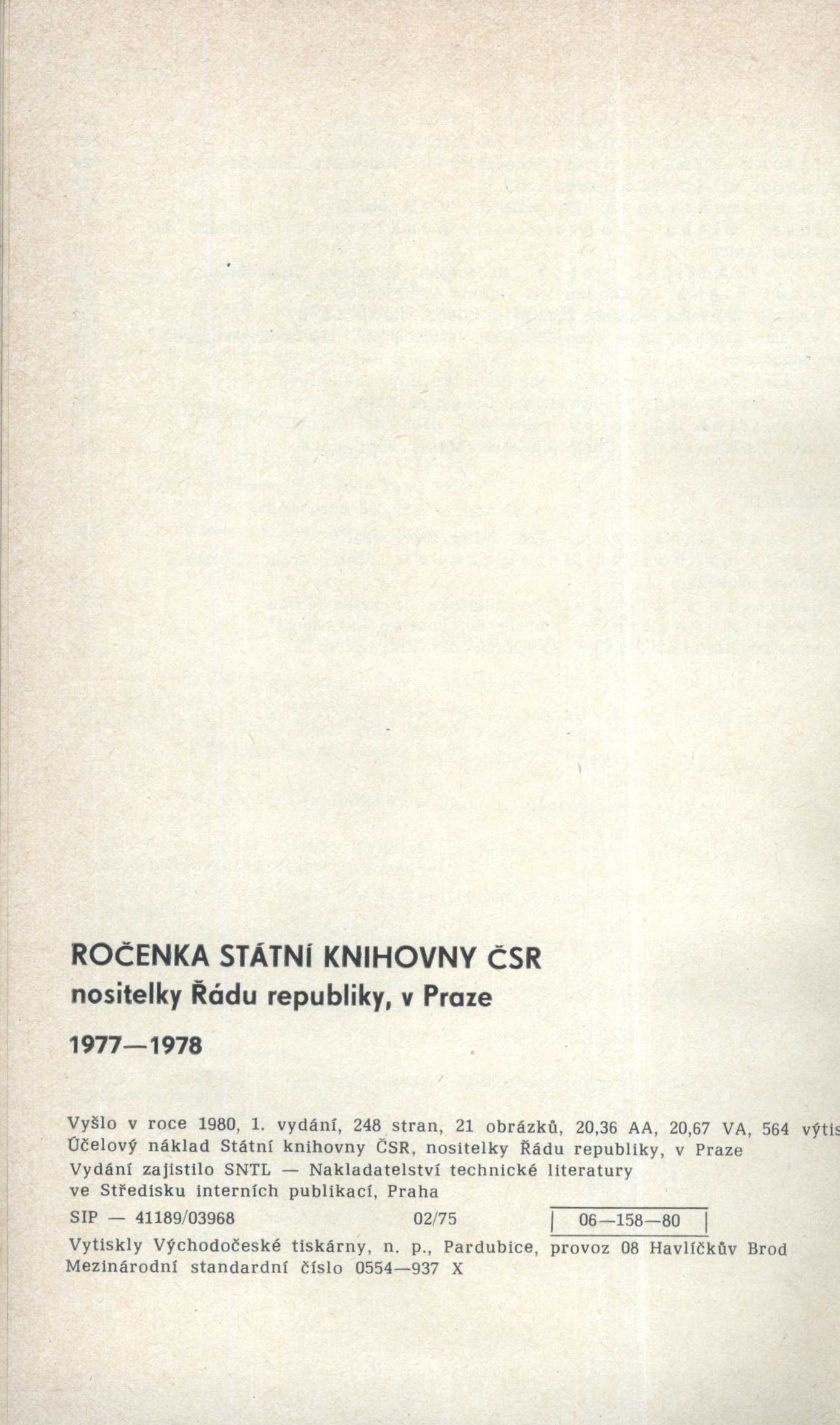 Title information Ročenka Státní knihovny ČSR nositelky Řádu republiky 1977-1978 Další autoři Státní knihovna České socialistické republiky (Publisher) Státní nakladatelství technické literatury (Publisher) Východočeské tiskárny (Printer) Edition statement 1. vydání Publication Praha : SNTL - Nakladatelství technické literatury, 1980 Manufacture Havlíčkův Brod : Východočeské tiskárny, n. p., Pardubice, provoz 08 Scope 245 stran : fotografie ; 21 cm ISSN 0554-977X Edition Edice Státní knihovny ČSR v Praze