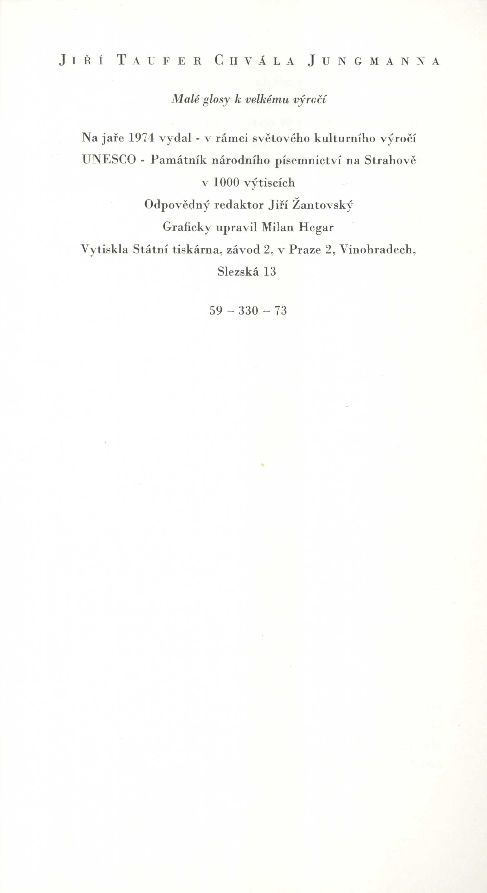 Title information Chvála Jungmanna : malé glosy k velkému výročí / Jiří Taufer ; graficky upravil Milan Hegar Personal name Taufer, Jiří, 1911-1986 (Author) Další autoři Hegar, Milan, 1921-1987 (Book designer) Corporation Památník národního písemnictví (muzeum literatury) (Publisher) Státní tiskárna v Praze (Printer) Publication Praha : Památník národního písemnictví, 1973 Manufacture Praha : Státní tiskárna, závod 2 Scope 30 stran : ilustrace, portréty, faksimile ; 25 cm ISBN (Volné listy) Country Czech Republic Language Czech Note Volné složky v deskách z tvrdšího papíru. - Modrá obálka s dvoubarevným textem. - Patitul. - Frontispis. - Dvoubarevný text na titulním listu. - Úvod. - Text. - Černobílé portréty, ilustrace, faksimile s popisky.