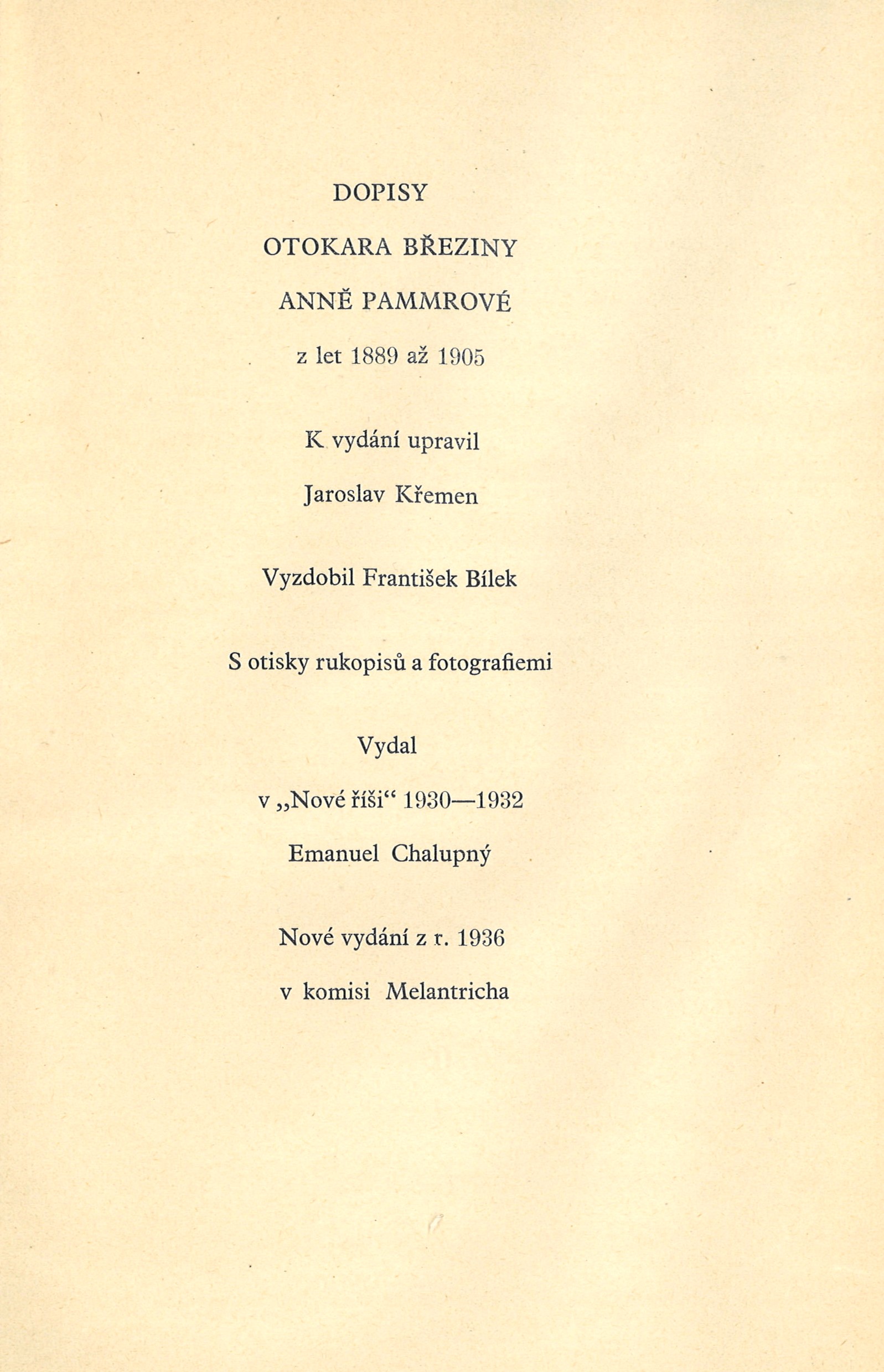 Title information Dopisy Otokara Březiny Anně Pammrové z let 1889-1905 / Otokar Březina ; k vydání připravil Jaroslav Křemen ; vyzdobil František Bílek Personal name Březina, Otokar, 1868-1929 (Author) Další autoři Křemen, Jaroslav (Editor) Bílek, František, 1872-1941 (Illustrator) Chalupný, Emanuel, 1879-1958 (Publisher) Corporation Melantrich (nakladatelství : 1910-1950) (Publisher) Publication Tábor : Emanuel Chalupný, 1936 Distribution Praha-Smíchov : v komisi nakladatelství Melantrich a.s. Scope 224 stran, 3 nečíslované listy obrazových příloh : portréty, faksimile ; 23 cm ISBN (Vázáno) Country Czech Republic Language Czech Note Zdobená obálka. - Frontispis. - Připomenutí vydavatelovo. - Úvod. - Dodatek. - Černobílé fotografie a faksimile rukopisů s popiskami v obrazové příloze na křídovém papíře. - Poznámky pod čarou. - Obsahuje biliografické odkazy.