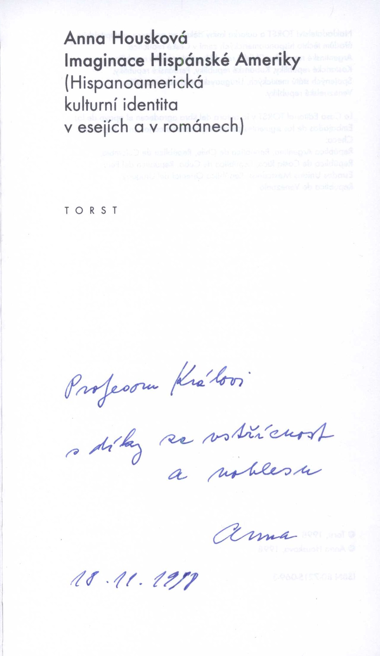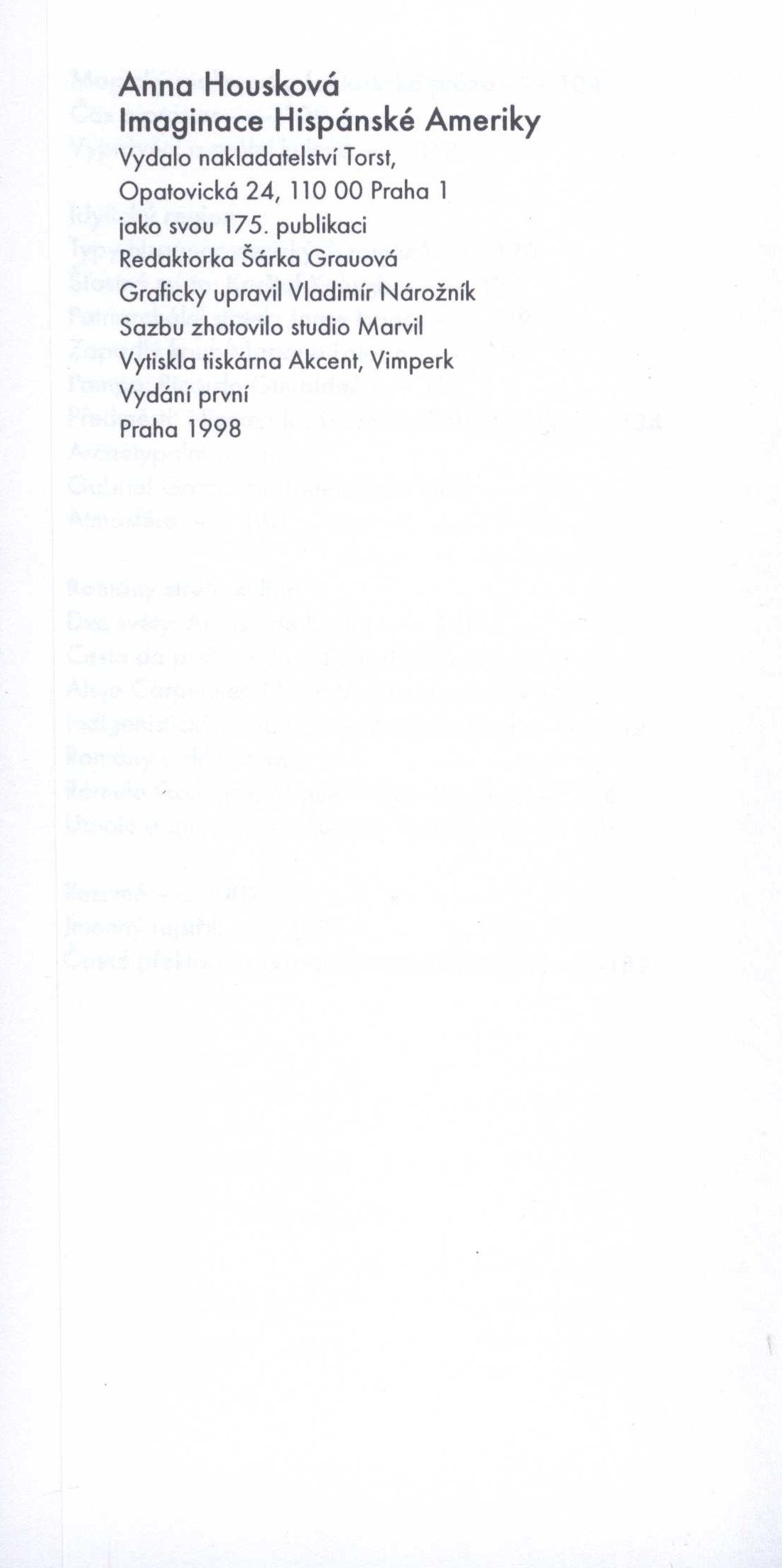 Title information Imaginace Hispánské Ameriky : (hispanoamerická kulturní identita v esejích a v románech) / Anna Housková Personal name Housková, Anna, 1948- (Author) (Dedicator) (Inscriber) Další autoři Král, Oldřich, 1930-2018 (Dedicatee) Nárožník, Vladimír, 1939-2002 (Book designer) Corporation Nakladatelství Torst (Publisher) Akcent tiskárna Vimperk (Printer) Další var.názvy Hispanoamerická kulturní identita v esejích a v románech Edition statement Vydání první Publication Praha : Torst, 1998 Manufacture Vimperk : tiskárna Akcent Scope 205 stran ; 20 cm ISBN 80-7215-069-3 (vázáno) Edition Malá řada kritického myšlení