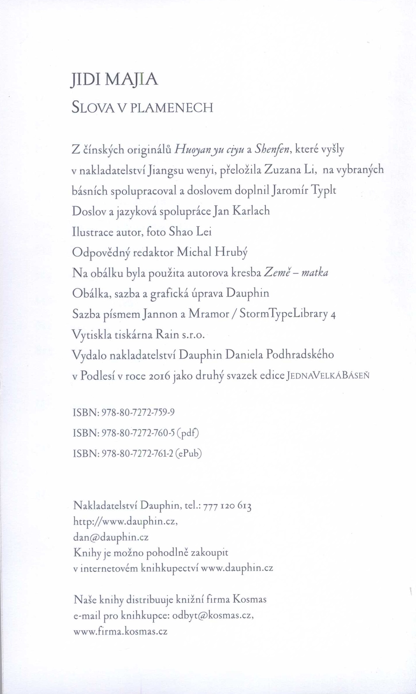 Title information Slova v plamenech / Jidi Majia ; z čínských originálů Huoyan yu ciyu a Shenfen ... přeložila Zuzana Li ; na vybraných básních spolupracoval a doslovem doplnil Jaromír Typlt Personal name Majia, Jidi, 1961- (Author) (Illustrator) Další autoři Li, Zuzana, 1975- (Translator) Typlt, Jaromír, 1973- (Translator) (Collaborator) (Author of afterword, colophon, etc.) Karlach, Jan, 1983- (Author of afterword, colophon, etc.) (Translator) (Collaborator) Gelman, Juan, 1930-2014 (Author of afterword, colophon, etc.) Majia, Jidi, 1961- Huo yan yu ci yu. Česky Majia, Jidi, 1961- Shen fen. Česky Corporation Nakladatelství Dauphin (Publisher) (Bookjacket designer) (Compositor) (Book designer) Rain (tiskárna) (Printer) (Printer of plates) Publication V Podlesí : nakladatelství Dauphin Daniela Podhradského, 2016 Manufacture [Otín] : Rain s.r.o. Scope 253 stran : ilustrace ; 21 cm ISBN 978-80-7272-759-9 (brožováno) Edition druhý svazek edice JednaVelkáBáseň