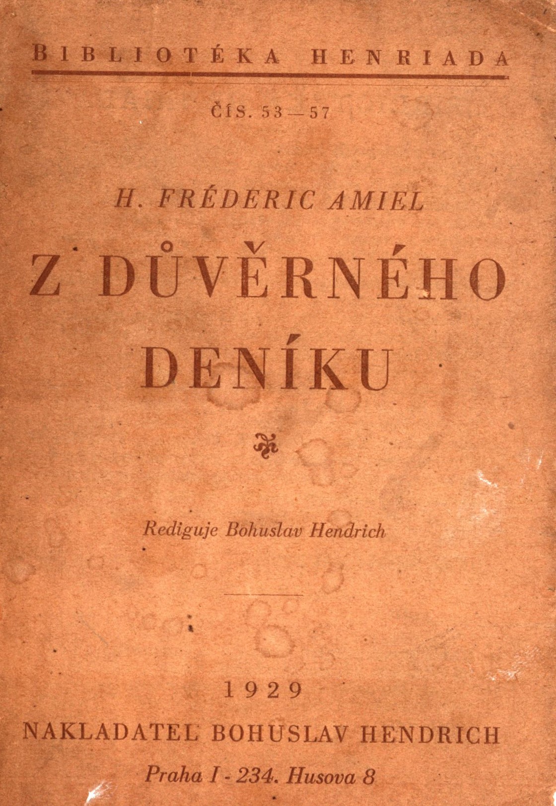 Title information Z důvěrného deníku / H. Fréderic Amiel ; přeložila a úvod napsala Růžena Thonová Personal name Amiel, Henri Frédéric, 1821-1881 (Author) Další autoři Thonová, Růžena, 1891-1971 (Translator) (Author of introduction) Corporation Bohuslav Hendrich (nakladatelství) (Publisher) Průmyslová tiskárna v Praze (Printer) Publication Praha : Bohuslav Hendrich, 1929 Manufacture Průmyslová tiskárna Scope 116 stran ; 16 cm Edition Bibliotéka Henriada ; čís. 53-57