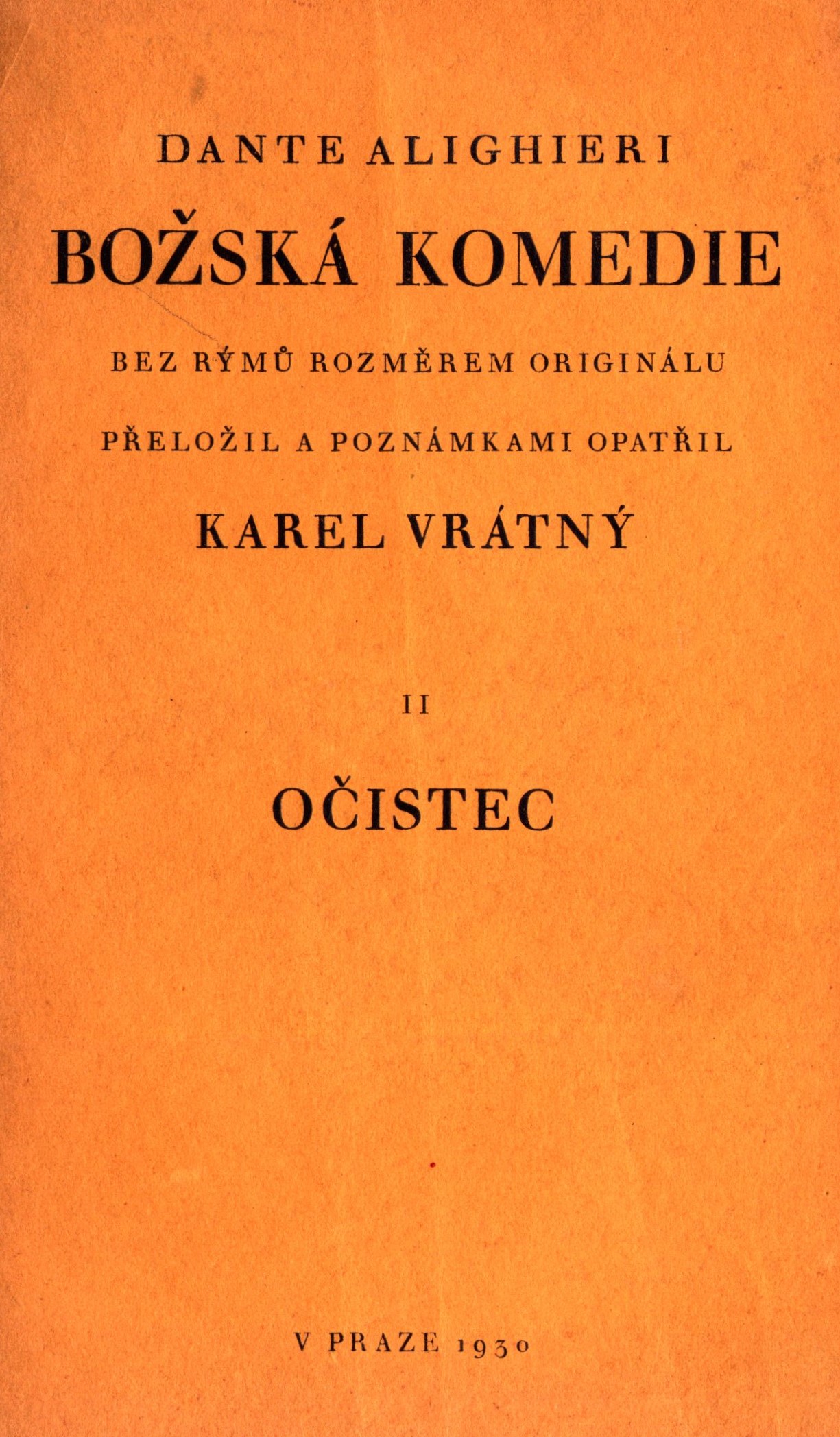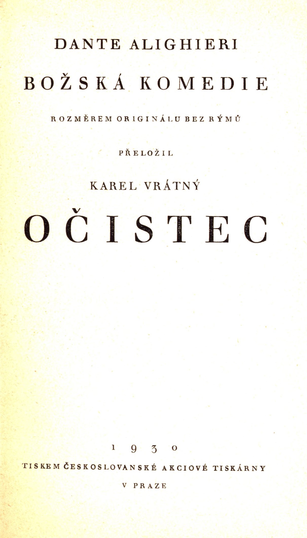 Title information Božská komedie. Očistec / Alighieri Dante ; rozměrem originálu bez rýmů přeložil Karel Vrátný Personal name Alighieri, Dante, 1265-1321 (Author) Další autoři Vrátný, Karel, 1867-1937 (Translator) Corporation Československá akciová tiskárna (tiskárna) (Printer) Publication Praha : [nakladatel neznámý], 1930 Manufacture V Praze : Tiskem Československé akciové tiskárny, 1930 Scope 198 stran ; 21 cm Country Czech Republic Language Czech Language of the original Italian Note Barevná obálka. - Obsah.