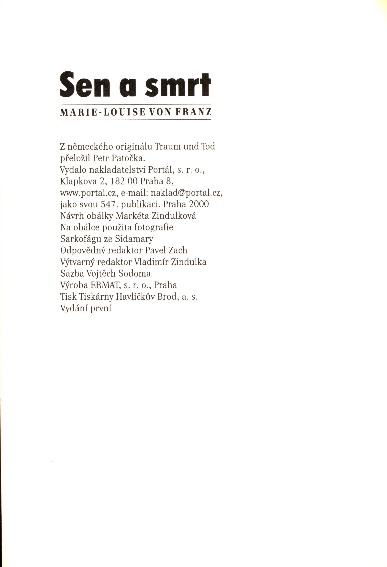 1. Title informationSen a smrt : o čem vypovídají sny umírajících / Marie-Louise von Franz ; z německého originálu Traum und Tod přeložil Petr Patočka ; návrh obálky Markéta Zindulková