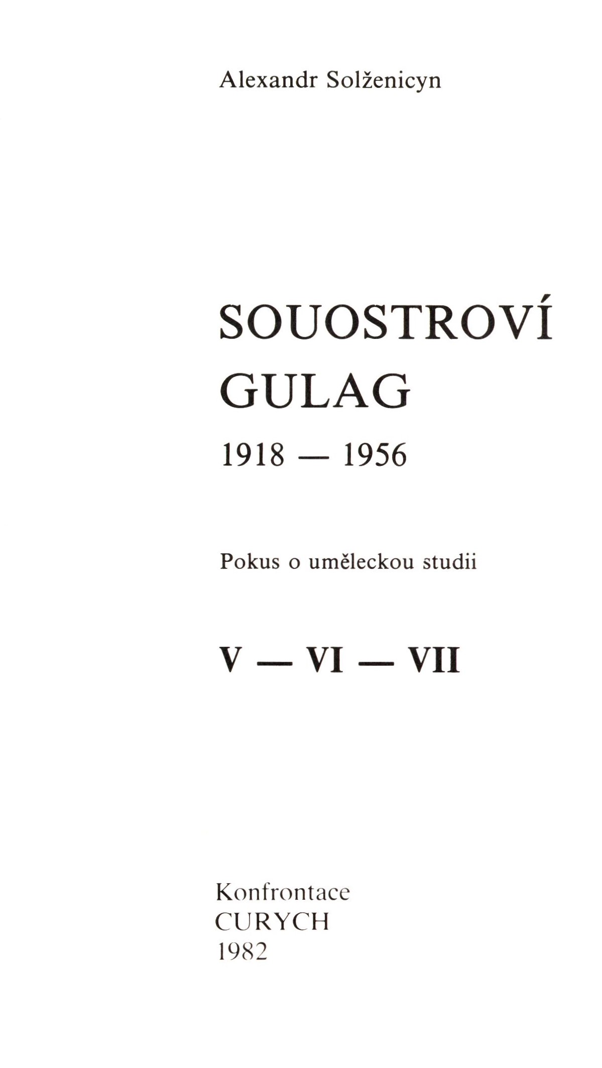 Title information Souostroví Gulag : 1918-1956 : pokus o uměleckou studii. V-VI-VII / Aleksandr Solženicyn ; z ruského originálu Archipelag Gulag ... přeložil Kruh překladatelů Praha ; obálku navrhl Jan Kristofori Personal name Solženicyn, Aleksandr Isajevič, 1918-2008 (Author) Další autoři Kristofori, Jan, 1931-2004 (Bookjacket designer) Corporation Kruh překladatelů (profesní organizace) (Translator) Konfrontace (nakladatelství) (Publisher) Publication Curych : Konfrontace, 1982 Scope 528 stran : portréty, fotografie ; 19 cm ISBN 3-85770-080-7 (brožováno) Edition Knižnice Konfrontace. Helvetia