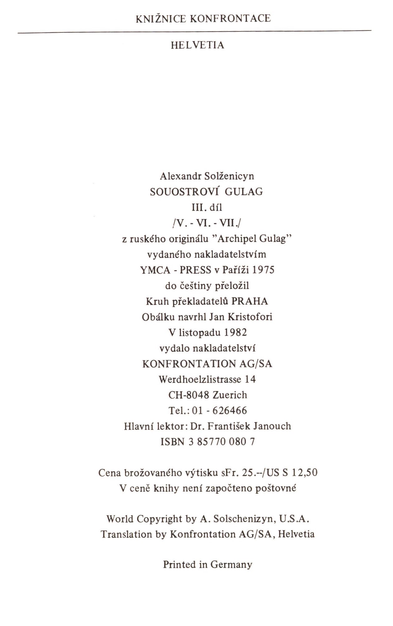 Knižnice Konfrontace, (Konfrontation AG Verlag, Zürich)Country Switzerland Language Czech Language of the original Russian Note Barevná zdobená obálka. - Černobílé ilustrace. - Obsah.