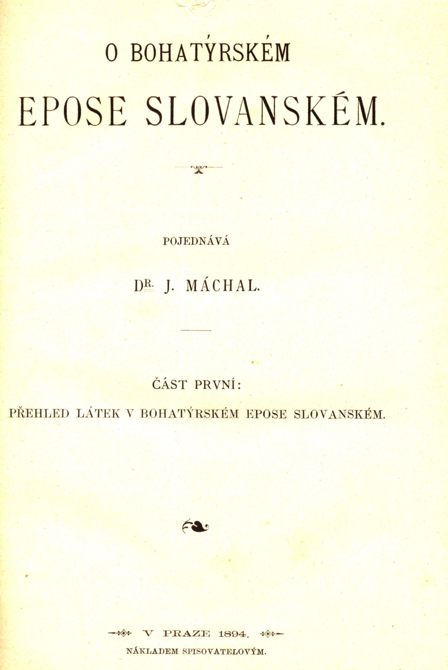 Title information O bohatýrském epose slovanském. Část první, Přehled látek v bohatýrském epose slovanském / pojednává J. Máchal Personal name Máchal, Jan, 1855-1939 (Author) (Publisher) Další autoři Bedřich Stýblo (firma) (Printer) Publication V Praze : J. Máchal, 1894 Manufacture Knihtiskárna B. Stýbla Scope 240 stran ; 23 cm ISBN (vázáno) Country Czech Republic Language Czech * Slavic (Other) Note Plátěná vazba. - Zdobený titulní list. - Obsah. - Vysvětlení zkrácenin. - Opravy.