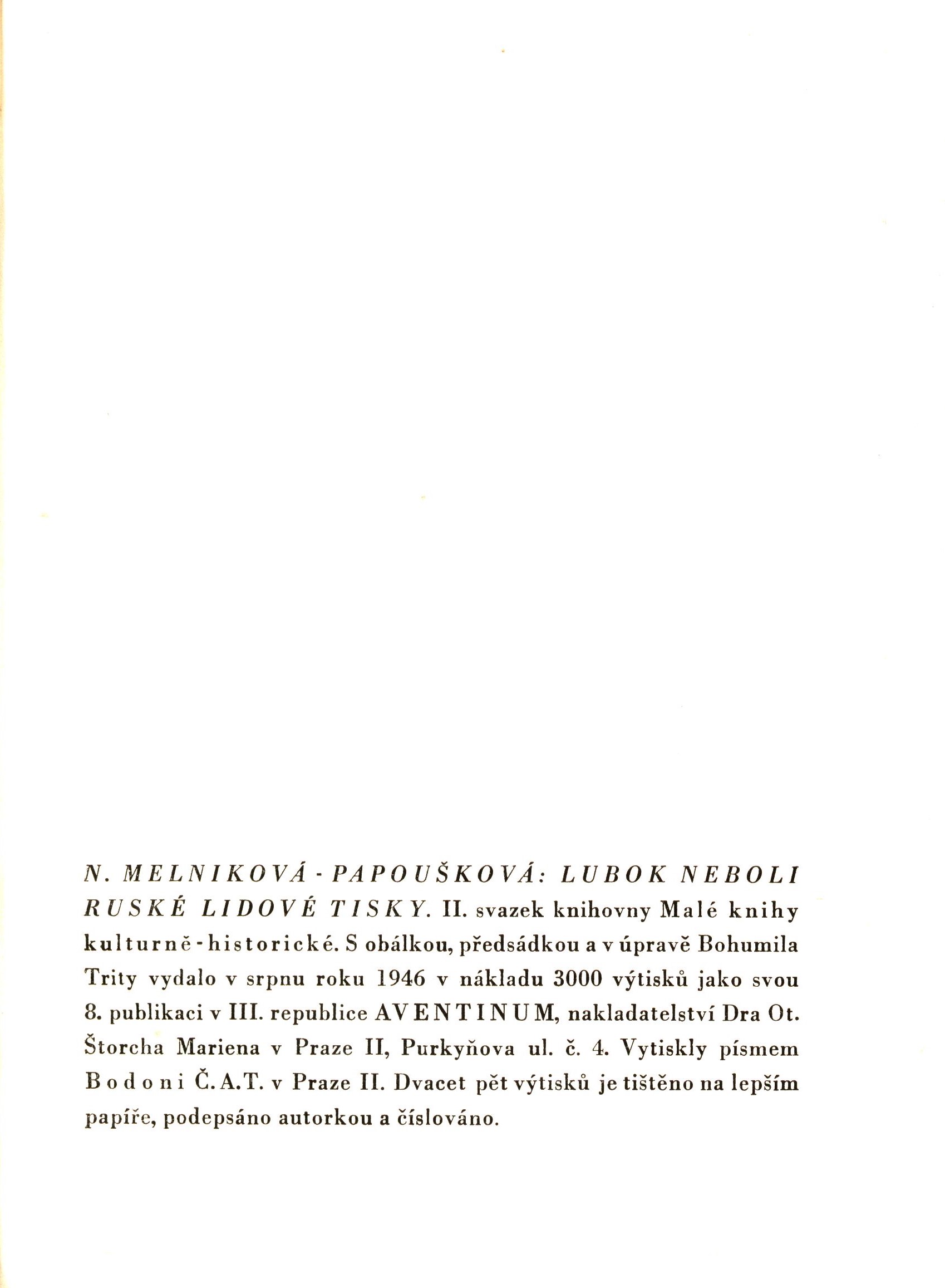 Title information Lubok neboli ruské lidové tisky / N. Melniková-Papoušková ; s obálkou a předsádkou a v úpravě Bohumila Trity Personal name Melniková-Papoušková, Naděžda Filaretovna, 1891-1978 (Author) Další autoři Trita, Bohumil, 1919-1979 (Book designer) (Bookjacket designer) Corporation Aventinum (nakladatelství) (Publisher) Č.A.T., Českomoravské akciové tiskařské a vydavatelské podniky (Praha) (Printer) Publication Praha : Aventinum, 1946 Manufacture Č.A.T. Scope 105 stran : ilustrace ; 21 cm ISBN (vázáno) Edition Malé knihy kulturně-historické ; svazek II