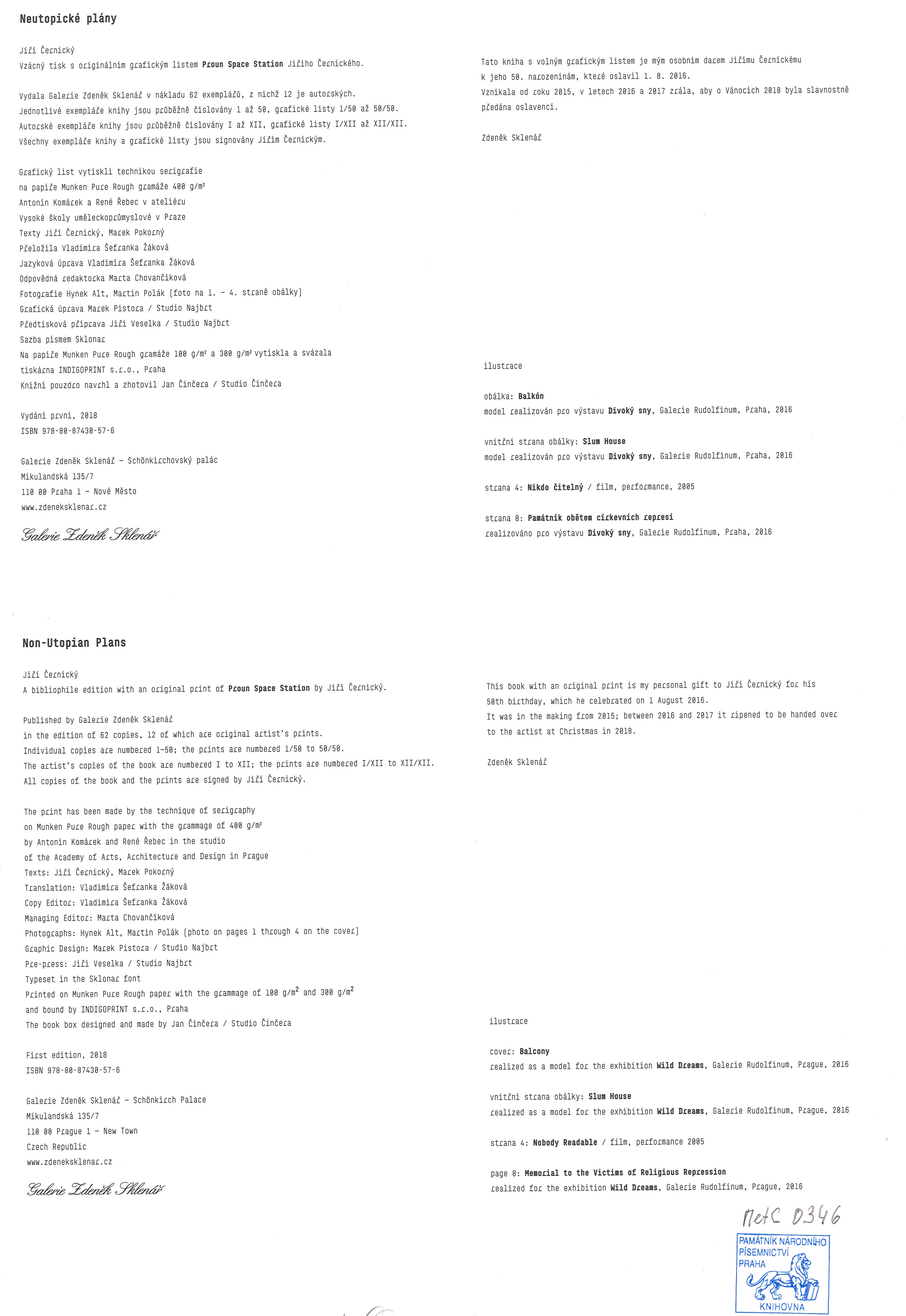 Note Vzácný tisk s originálním grafickým listem Proun Space Station Jiřího Černického. - Vydáno 62 exemplářů, jednotlivé exempláře jsou průběžně číslovány 1-50, autorské exempláře jsou průběžně číslovány I-XII. Všechny exempláře knihy a grafické listy jsou signovány Jiřím Černickým. - Grafický list vytiskli technikou serigrafie Antonín Komárek a René Řebec v ateliéru Vysoké školy uměleckoprůmyslové v Praze. - Celostránkové černobílé ilustrace a návrhy výtvarných děl. - Přetištěné ruční popisky a texty. - Sešit s průvodním textem. - Modré desky s chlopněmi, žluté ochranné kartonové pouzdro