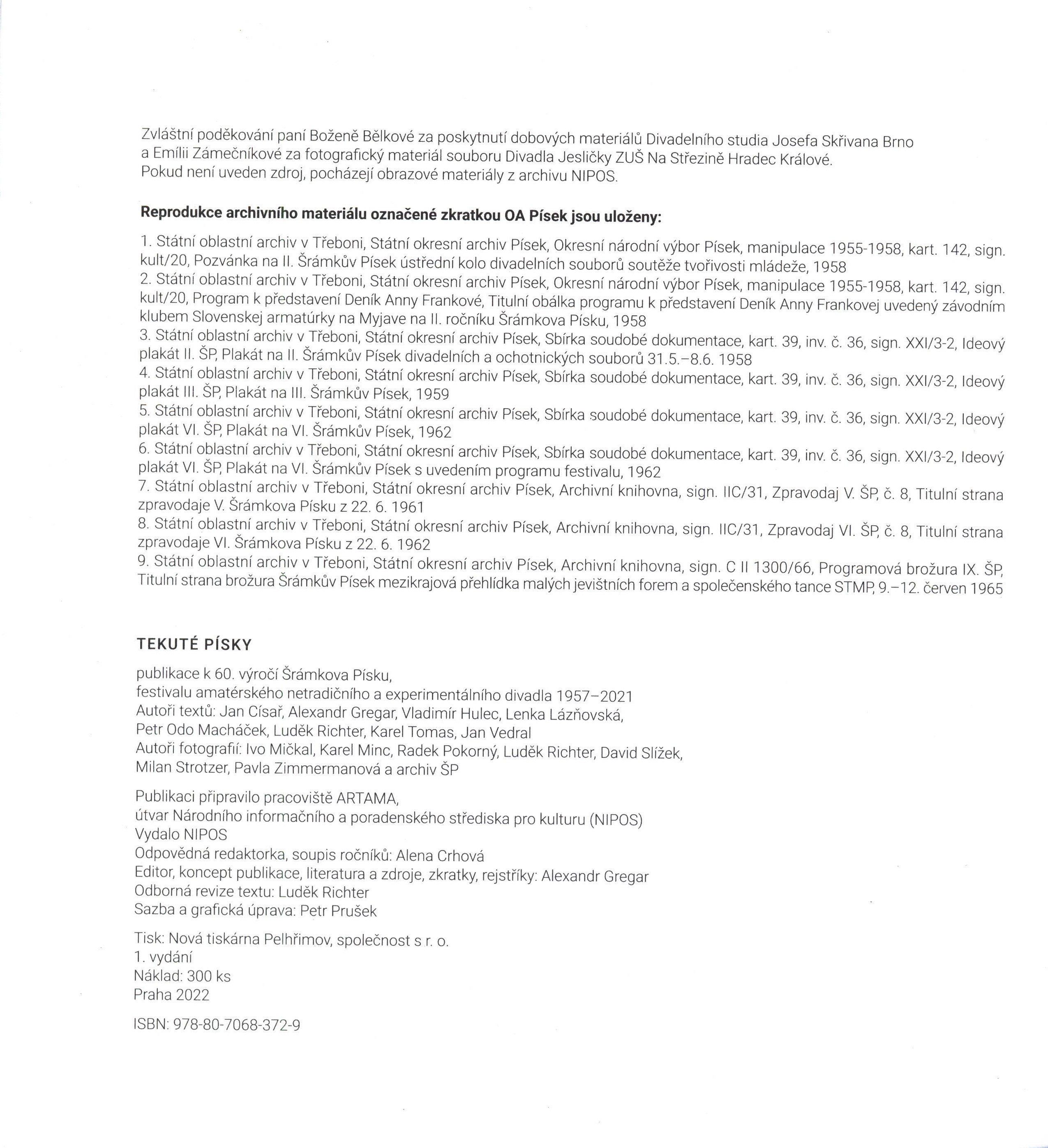 Title information Tekuté písky : šedesát ročníků Šrámkova Písku, národního festivalu amatérského divadla - mladého, netradičního, autorského, alternativního, divadla v pohybu etc. : od malých jevištních forem k divadlu experimentálnímu... : 1957-2021 / Jan Císař, Alena Crhová, Alexandr Gregar, Vladimír Hulec, Lenka Lázňovská, Petr Odo Macháček, Luděk Richter, Karel Tomas, Jan Vedral Personal name Císař, Jan, 1932-2021 (Author) (Honoree) Další autoři Crhová, Alena, 1957- Gregar, Alexandr, 1943- (Author) Hulec, Vladimír, 1958- (Author) Lázňovská, Lenka, 1948- (Author) Macháček, Petr, 1968- (Author) Richter, Luděk, 1949- (Author) Tomas, Karel, 1958- (Author) Vedral, Jan, 1955- (Author) Šrámková, Vítězslava, 1943-2019 (Honoree) Edition statement 1. vydání Publication Praha : NIPOS, 2022 Scope 267 stran : ilustrace, portréty, faksimile ; 24 cm ISBN 978-80-7068-372-9 (brožováno) Country Czech Republic Language Czech Note Zdobená fotografická obálka. - Černobílé fotografie v textu. - 300 výtisků