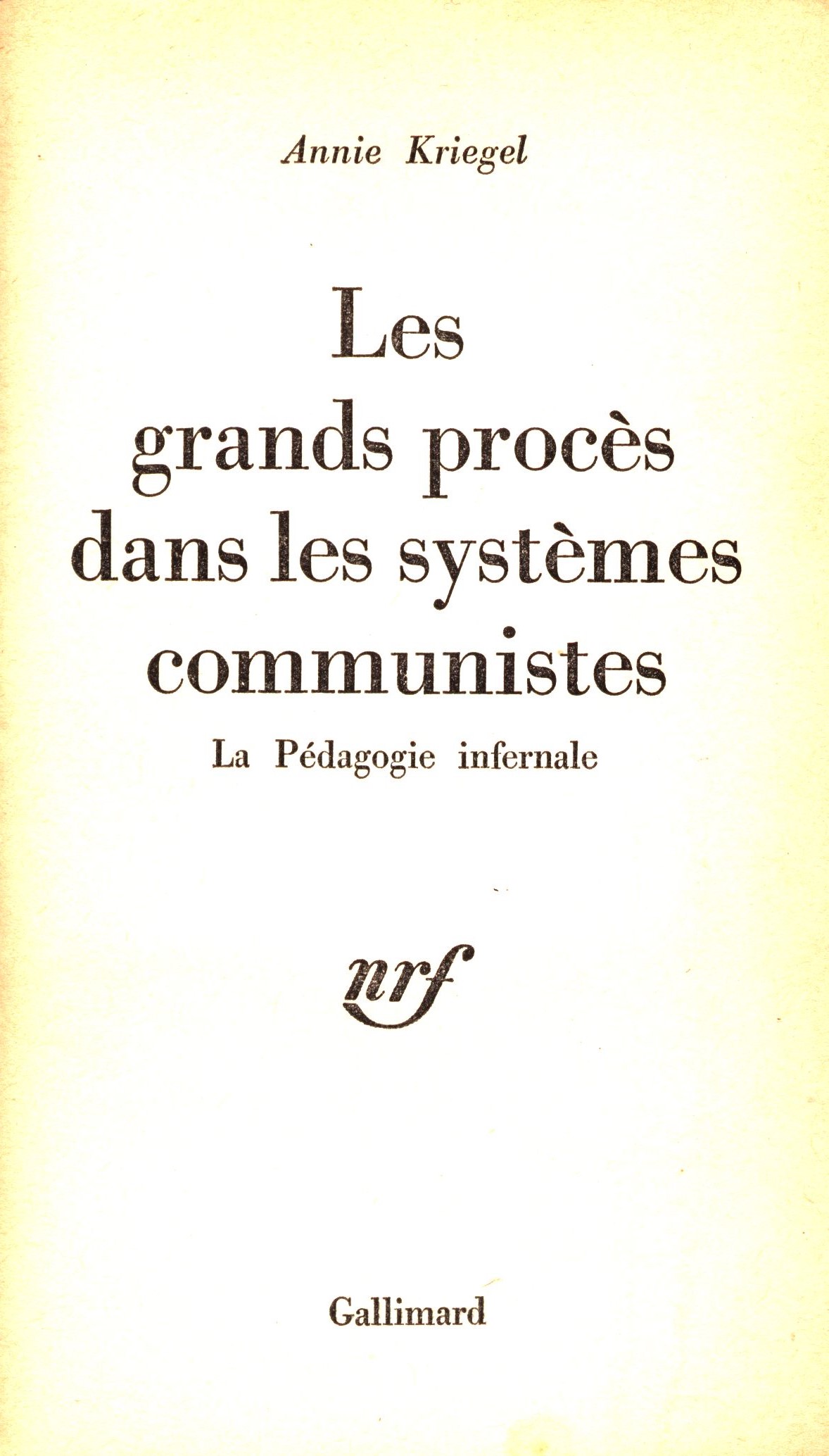 Les Grands procès dans les systèmes communistes : la pédagogie infernale / Annie Kriegel. -- [Paris] : Gallimard, [1972]. -- Saint-Amand : Imprimerie Bussière. -- 189 stran ; 18 cm. -- (Collection idées ; 256). -- Barevná zdobená obálka. - Titulní list s nakladatelskou značkou. - Obsah. - Poznámky. - Bibliografie autora. - Na zadní straně obálky anotace. -- ISBN : (brožováno).