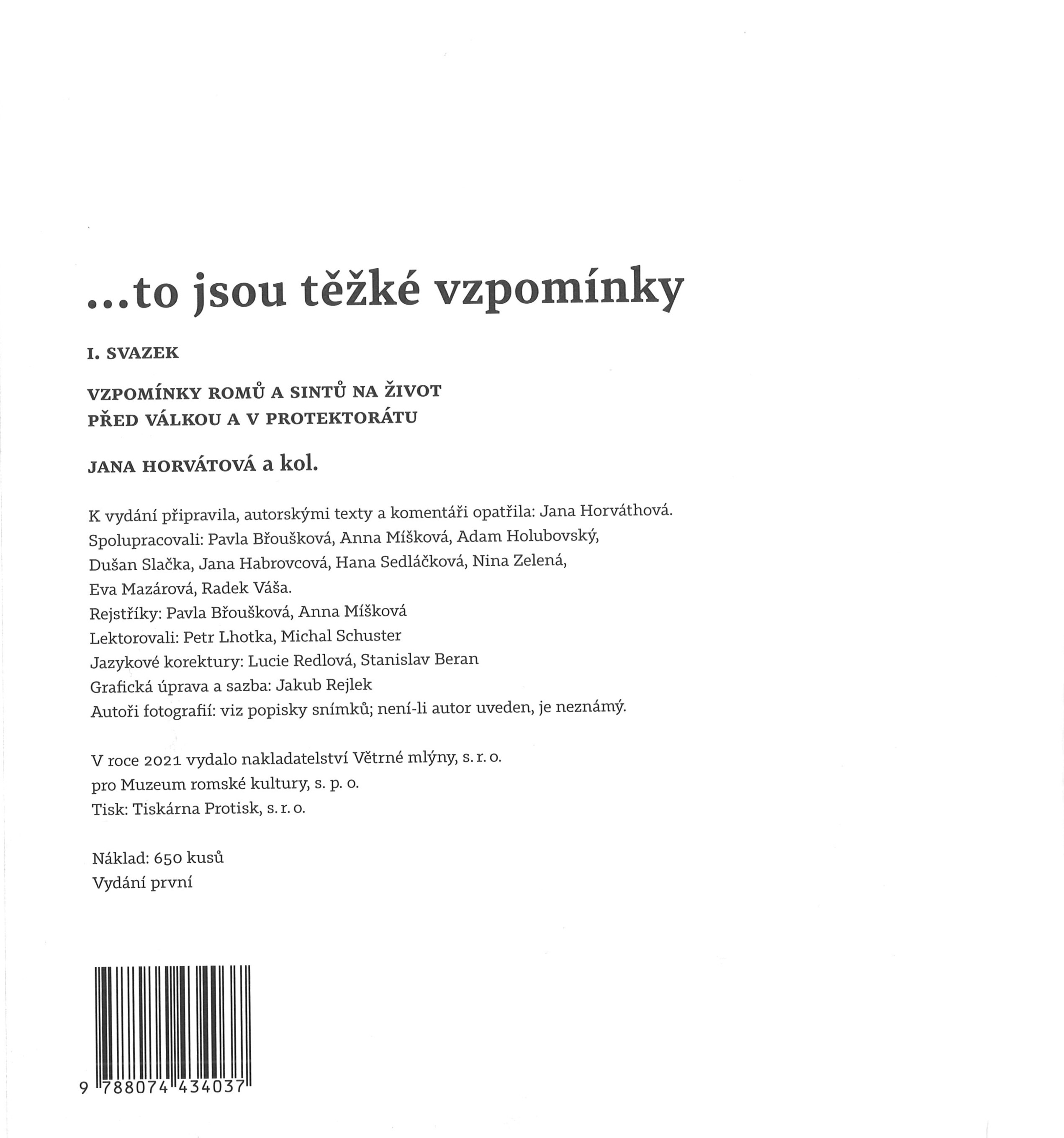 Title information ...to jsou těžké vzpomínky. I. svazek, Vzpomínky Romů a Sintů na život před válkou a v protektorátu / Jana Horváthová a kol. ; grafická úprava a sazba Jakub Rejlek Personal name Horváthová, Jana, 1967- (Author) Další autoři Rejlek, Jakub, 1979- (Book designer) Corporation Muzeum romské kultury (Brno, Česko) (Publisher) Větrné mlýny (nakladatelství) (Publisher) Protisk (tiskárna, Slavkov u Brna) (Printer) Edition statement Vydání první Publication Brno : Větrné mlýny : Muzeum romské kultury, 2021 Manufacture [Slavkov u Brna] : Tiskárna Protisk, s.r.o. Scope 771 stran : ilustrace (některé barevné), portréty, faksimile ; 28 cm ISBN 978-80-86656-45-8 (Muzeum romské kultury ; I. svazek ; vázáno) 978-80-7443-403-7 (Větrné mlýny ; I. svazek ; vázáno) Country Czech Republic Language of the original Czech Note K vydání připravila, autorský mi texty a komentáři opatřila Jana Hotváthová. - Zdobená rastrovaná vazba bez přebalu. - Úvodní slovo. - Bohatý doprovodný fotografický materiál
