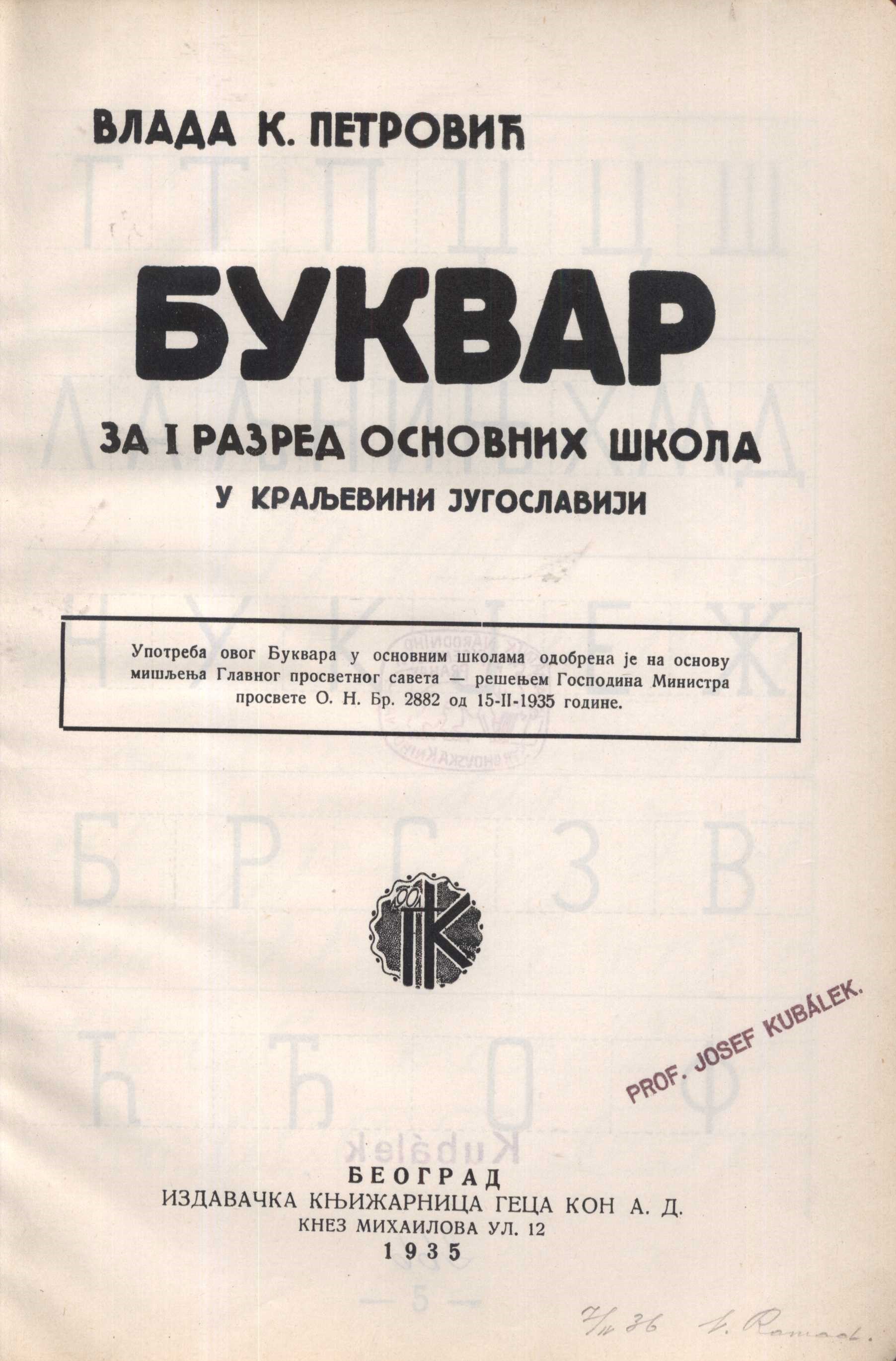 Title information Bukvar : za I razred osnovnich škola u Kraljevini Jugoslaviji / Vlada K. Petrovič Publication Beograd : Izdavačka knjižarnica Geca Kon, 1935 Scope 64 stran : ilustrace ; 23,5 cm ISBN (Vázáno) Country Serbia Language Serbian Note Zdob. obálka. - Frontispis. - Převážně barevné ilustrace