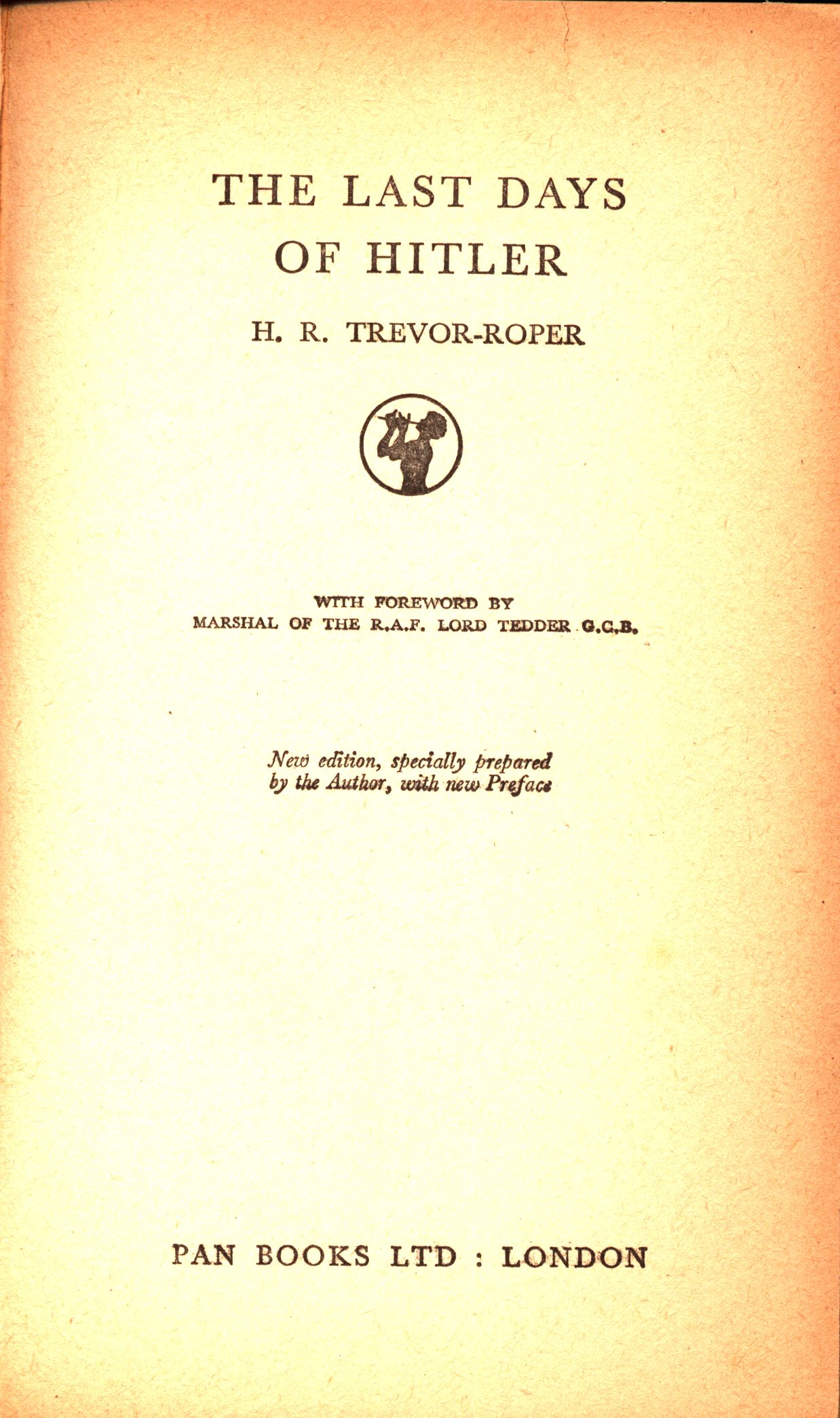 Title information The last days of Hitler / by H. R. Trevor-Roper ; with foreword by Lord Tedder Personal name Trevor-Roper, H. R. (Hugh Redwald), 1914-2003 (Author) Další autoři Tedder, Arthur William Tedder, Baron, 1890-1967 (Author of introduction) Corporation Pan Books, London (nakladatelství) (Publisher) Richard Clay & Co (Printer) Edition statement New edition Publication London : Pan Books, 1955 Manufacture Bungay : Richard Clay and Company, Ltd. Scope 266 stran ; 18 cm ISBN (brožováno) Edition PAN books ; GP12