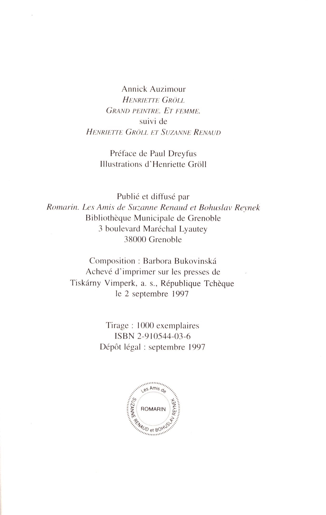 - Title information - Henriette Gröll : grand peintre et femme / Annick Auzimour ; préface de Paul Dreyfus ; illustrations d'Henriette Gröll ; composition Barbora Bukovinská - Personal name - Auzimour, Annick, 1943- (Author) (Signer) - Další autoři - Dreyfus, Paul, (Author of afterword, colophon, etc.) 1923-2017 - Gröll, Henriette, 1906-1996 (Illustrator) - Bukovinská, Barbora (Compositor) - Corporation - Romarin, les amis de Suzanne Renaud et Bohuslav Reynek (sdružení) (Publisher) - Tiskárny Vimperk (firma) (Printer) - Publication - Grenoble : Romarin, 1997 - Manufacture - Vimperk : Tiskárny Vimperk a.s. - Scope - 137 stran : ilustrace (některé barev.), portréty ; 20 cm - ISBN - 2-910544-03-6 (vázáno) - Country - France - Language - French - Note - Barevná zdobená obálka. - Ilustrace, fotografie. - Chronologie. - Soupis ilustrací.