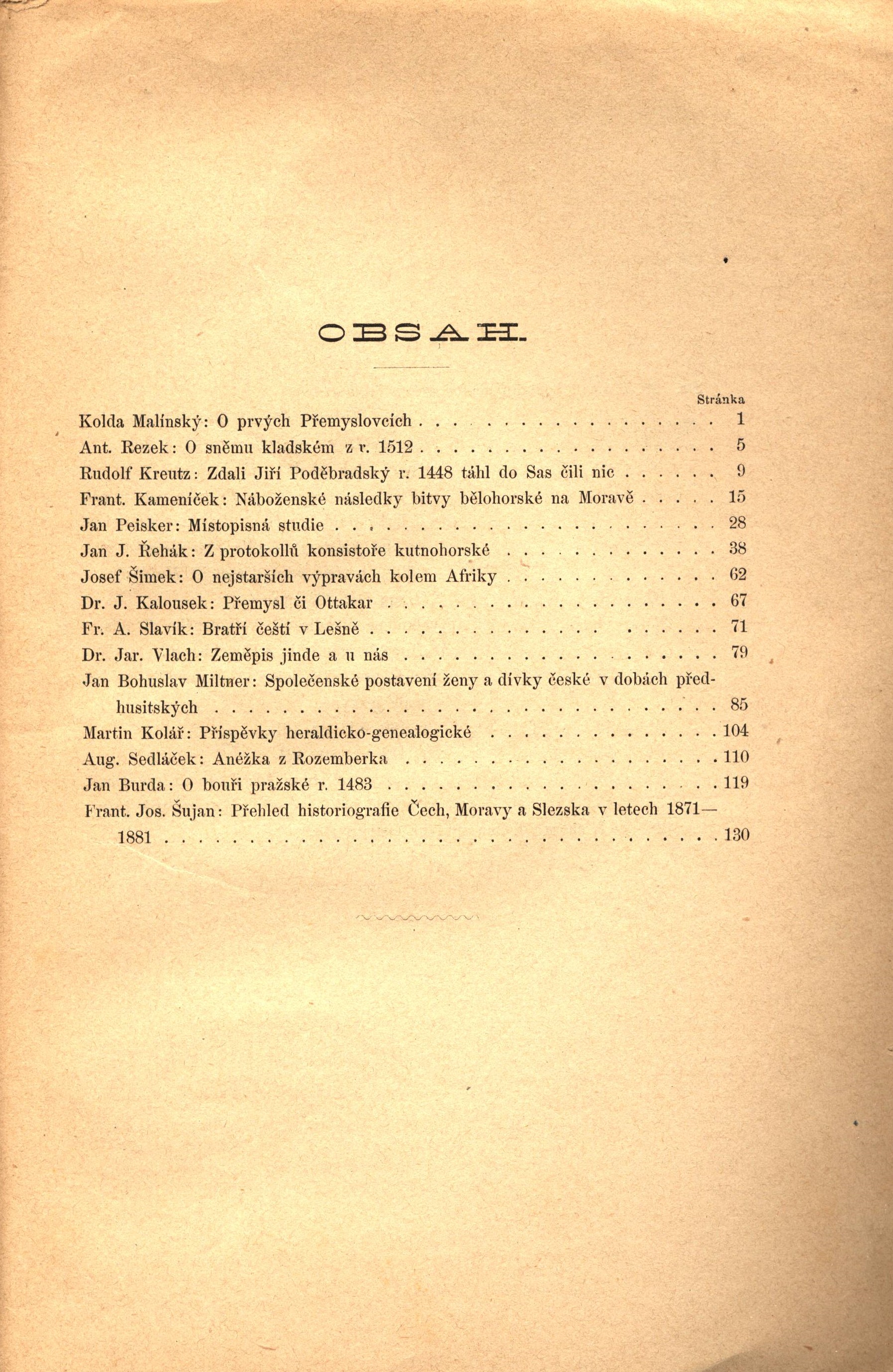 Title information Sborník historický vydaný na oslavu desítiletého trvání Klubu historického v Praze / za redakce zvláštní kommisse klubovní Další autoři Nakladatelství Jan Otto (Publisher) Historický klub (spolek) (Redactor) J. Otto (knihtiskárna) (Printer) Publication V Praze : tiskem a nákladem J. Otty, 1883 Scope 156 stran ; 25 cm ISBN (Brožováno) Country Czech Republic Language Czech Note Historické studie různých autorů. - Tenká obálka s nakladatelským logem. - Titulní list shodný s obálkou. - Na přídeští a zadní straně obálky nakladatelské upoutávky