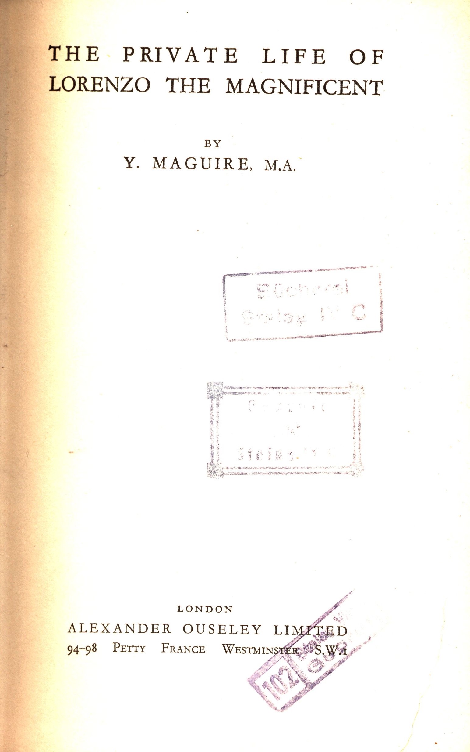 Title information The private life of Lorenzo the Magnificent / by Y. Maguire Personal name Maguire, Yvonne (Author) Další autoři Alexander Ouseley Limited (nakladatelství) (Publisher) Tonbridge Printers Ltd. (Printer) Publication London Alexander Ouseley Limited, 1936 Manufacture Tonbridge : Tonbridge Printers Ltd. Scope 208 stran ; 22 cm ISBN (vázáno) Country United Kingdom Language English Note Plátěná vazba. - Frontispis. - Obsah.