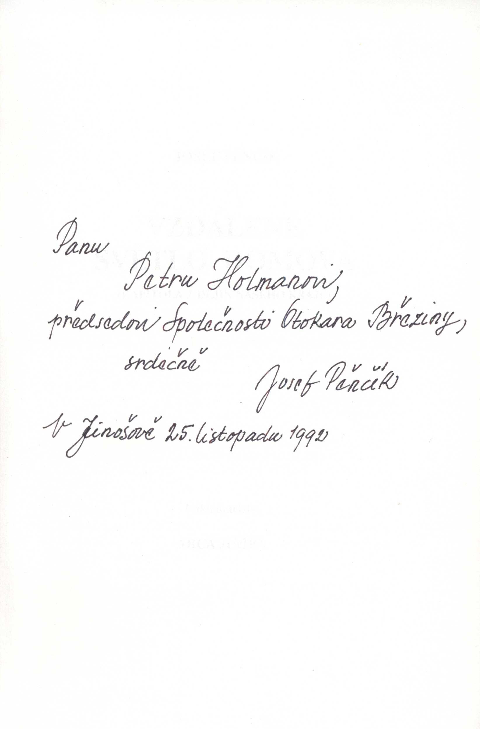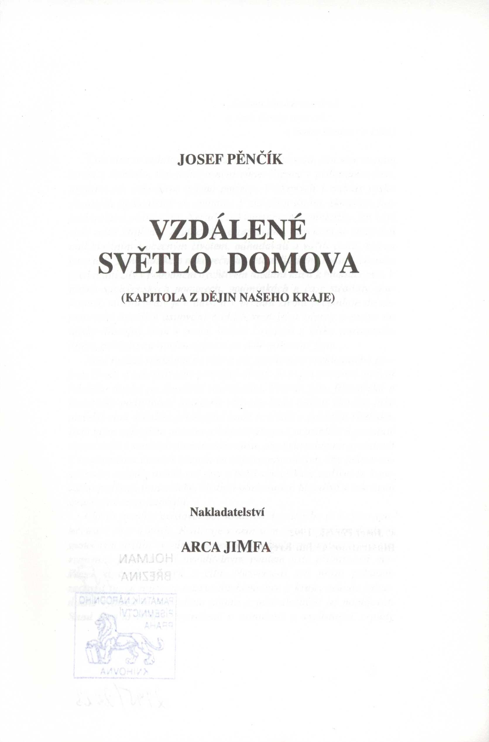 Title information Vzdálené světlo domova : (kapitola z dějin našeho kraje) / Josef Pěnčík ; obálka a ilustrace Jan Krejčí Personal name Pěnčík, Josef, 1925-2016 (Author) (Dedicator) (Inscriber) Další autoři Krejčí, Jan, 1942-2001 (Bookjacket designer) (Illustrator) Holman, Petr, 1951-2019 (Dedicatee) Corporation Nakladatelství Arca JiMfa (Publisher) Publication Třebíč : Arca JiMfa, 1992 Scope 152 stran : ilustrace ; 22 cm ISBN (Brožováno) Country Czech Republic Language Czech Note Zdobená dvoubarevná obálka. - Černobílé ilustrace s popiskami. - Obsah. - 1000 výtisků.